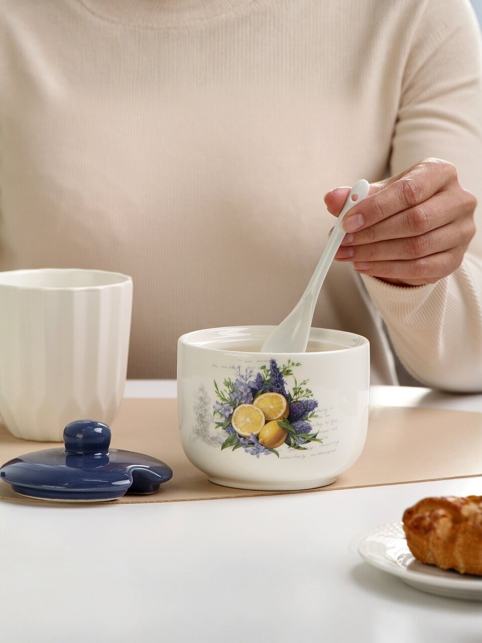 - Доломитовая сахарница с авторским дизайном «Лаванда» — гармония эстетики и практичности.