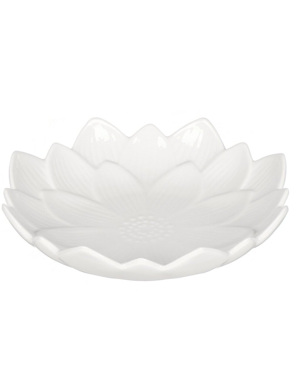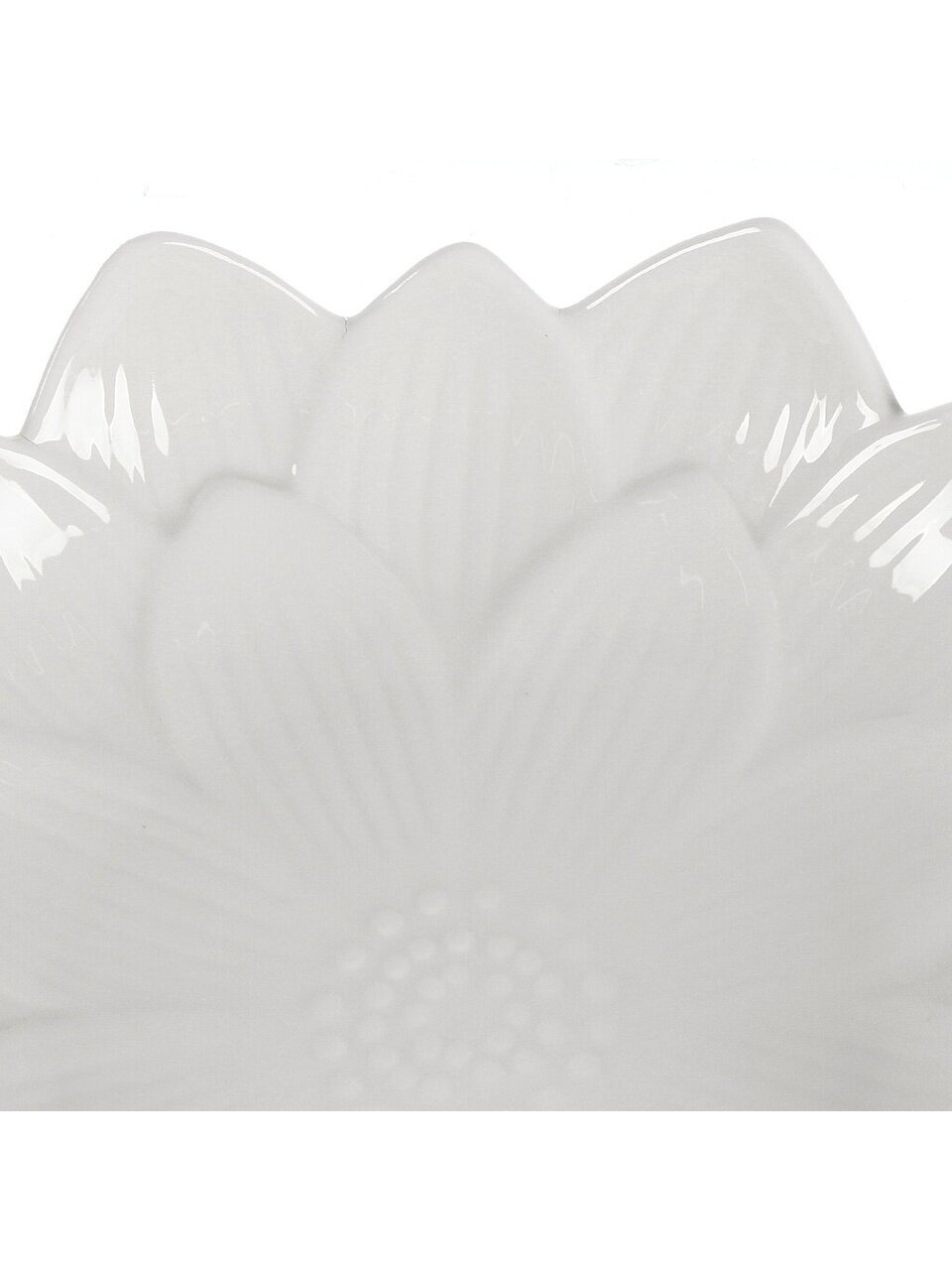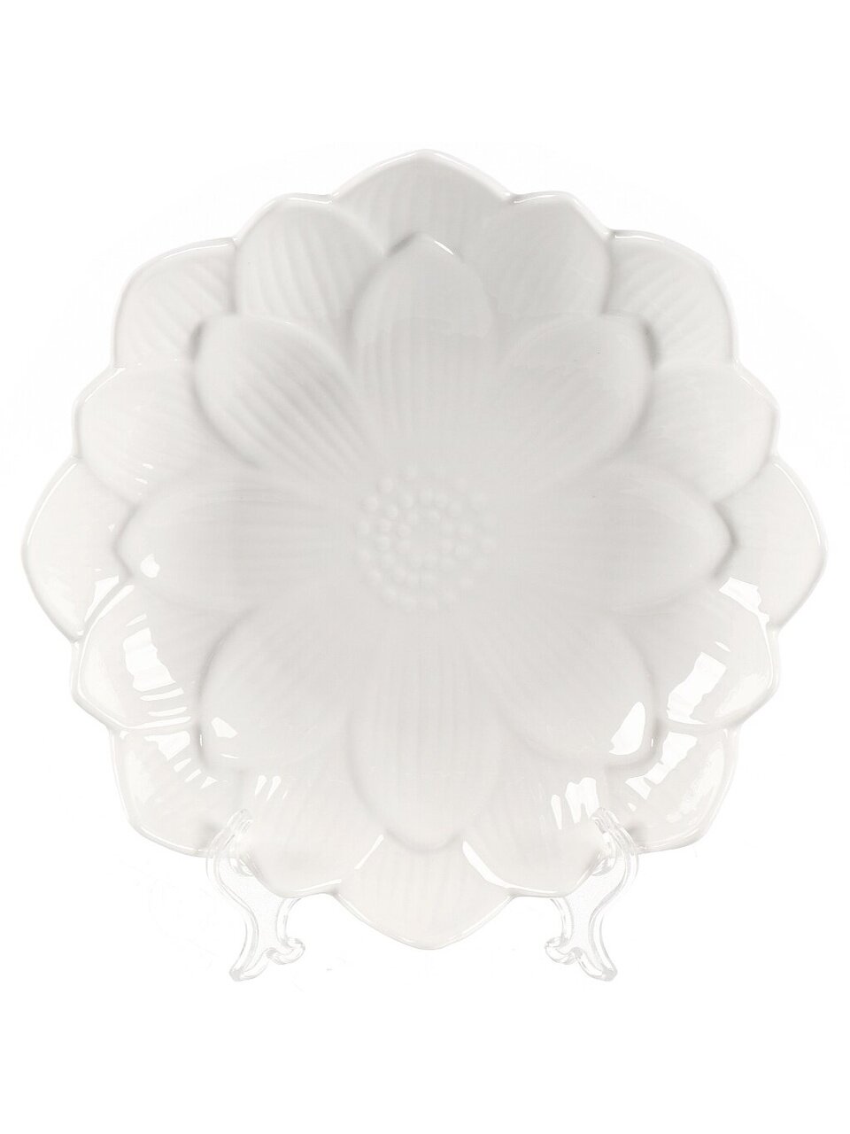 Объем — 0.75 л (округленно 0.8 л), диаметр — 24.5 см, высота — 6.5 см. Форма фигурная, цвет белый, материал — фарфор.