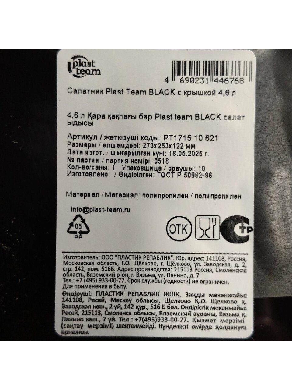 Салатник Plast Team Black 4.6 л с крышкой — вместительный и стильный выбор для хранения, сервировки и транспортировки блюд. Прочный пластик, современный дизайн, подходит для СВЧ и посудомоечной машины.