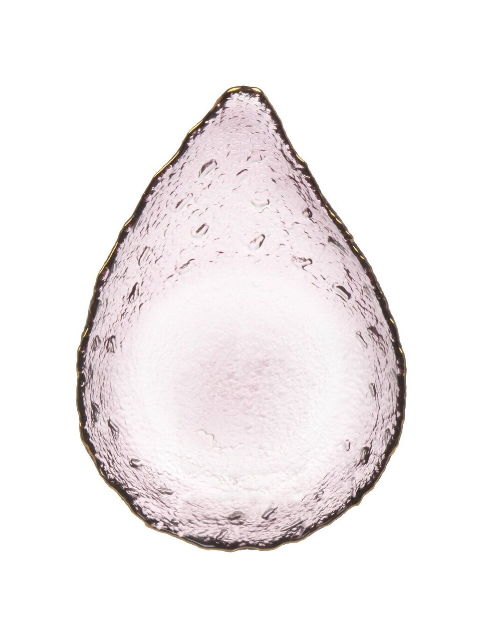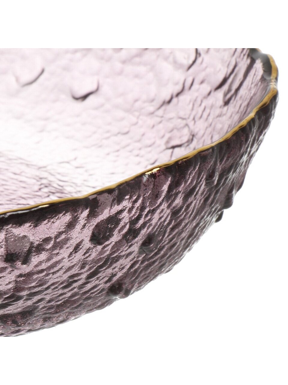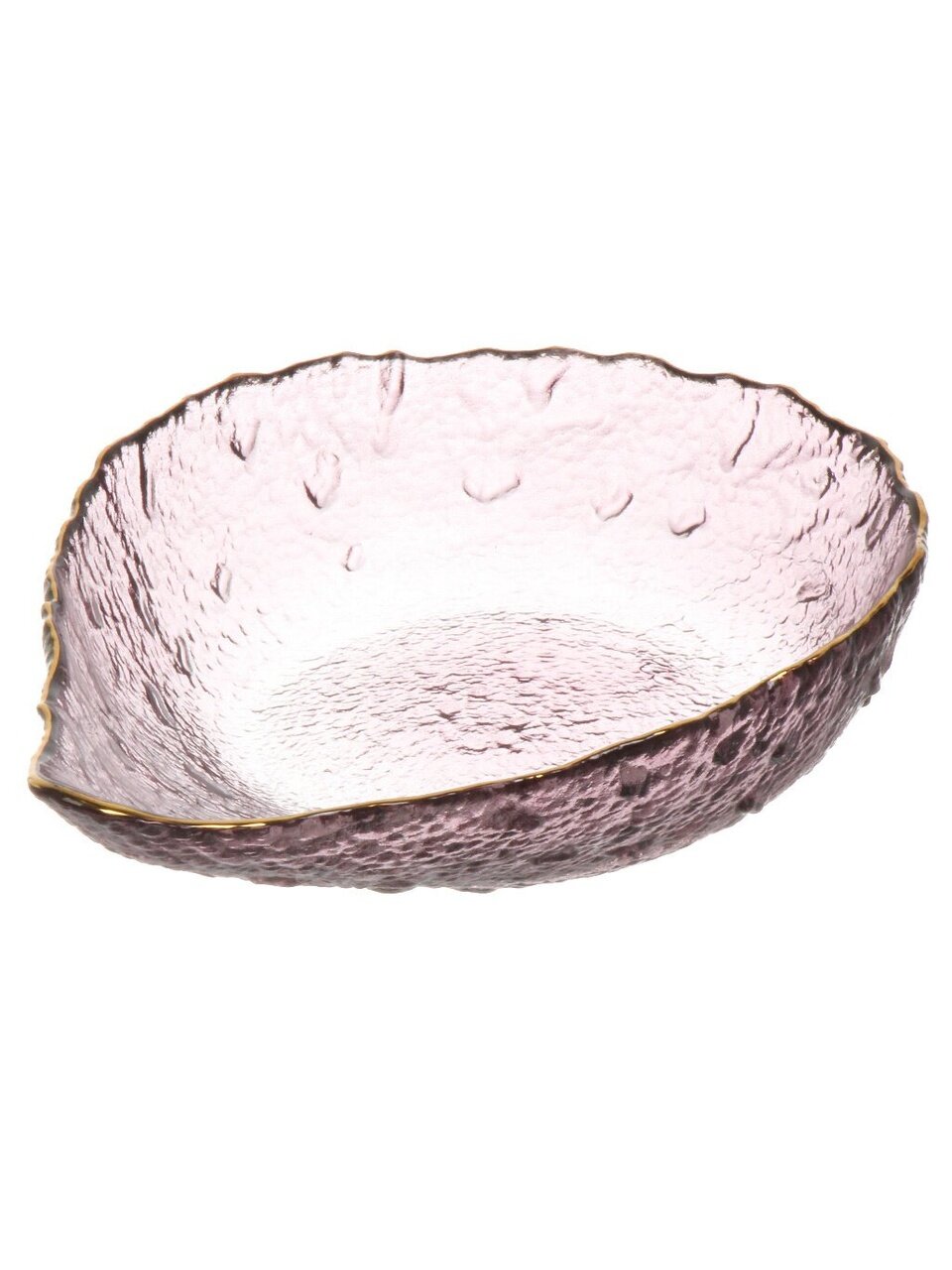 Салатник выполнен из прочного стекла, имеет фигурную форму, однотонный розовый цвет, рельефный узор и золотую отводку, поставляется в подарочной упаковке.