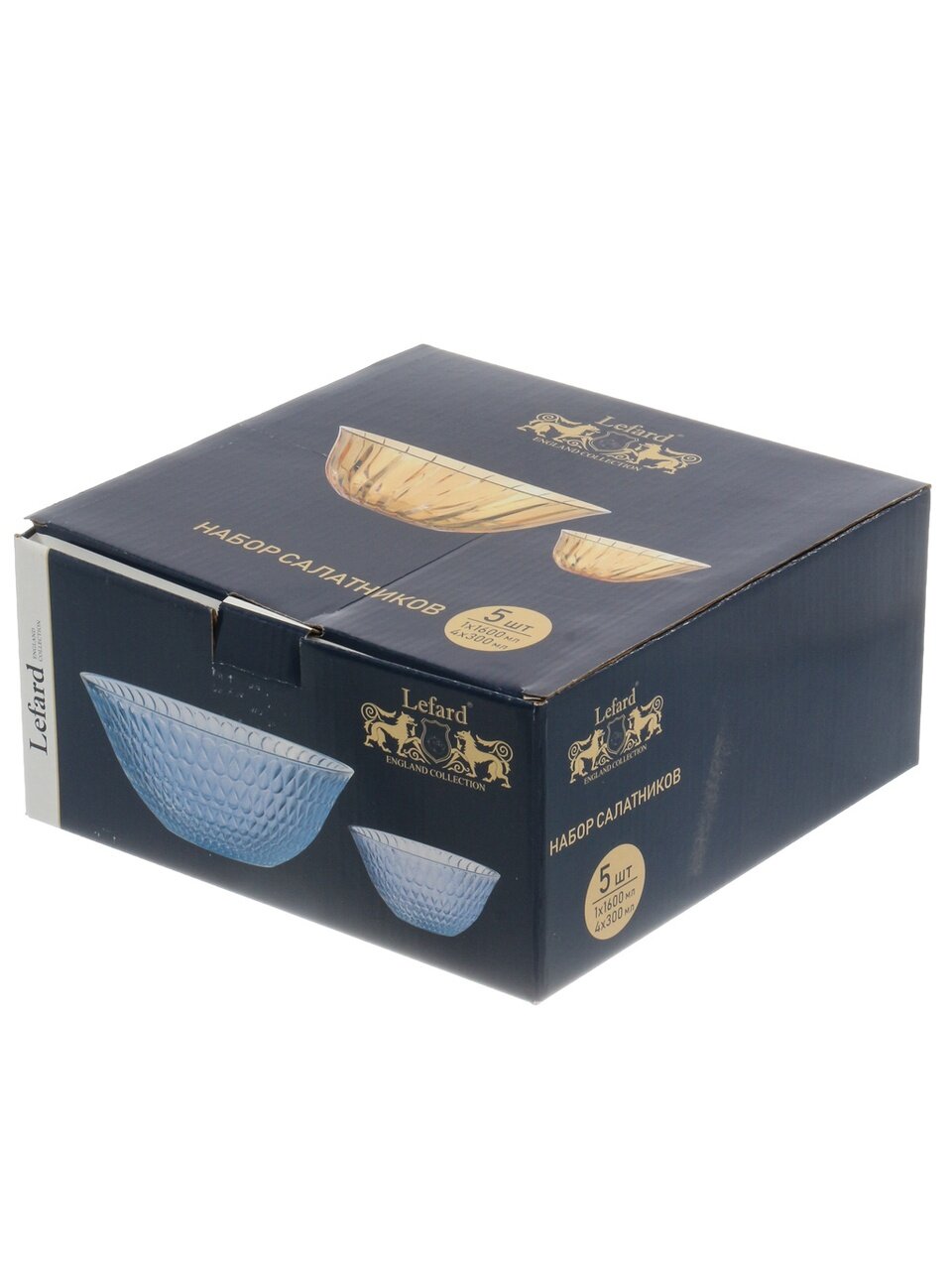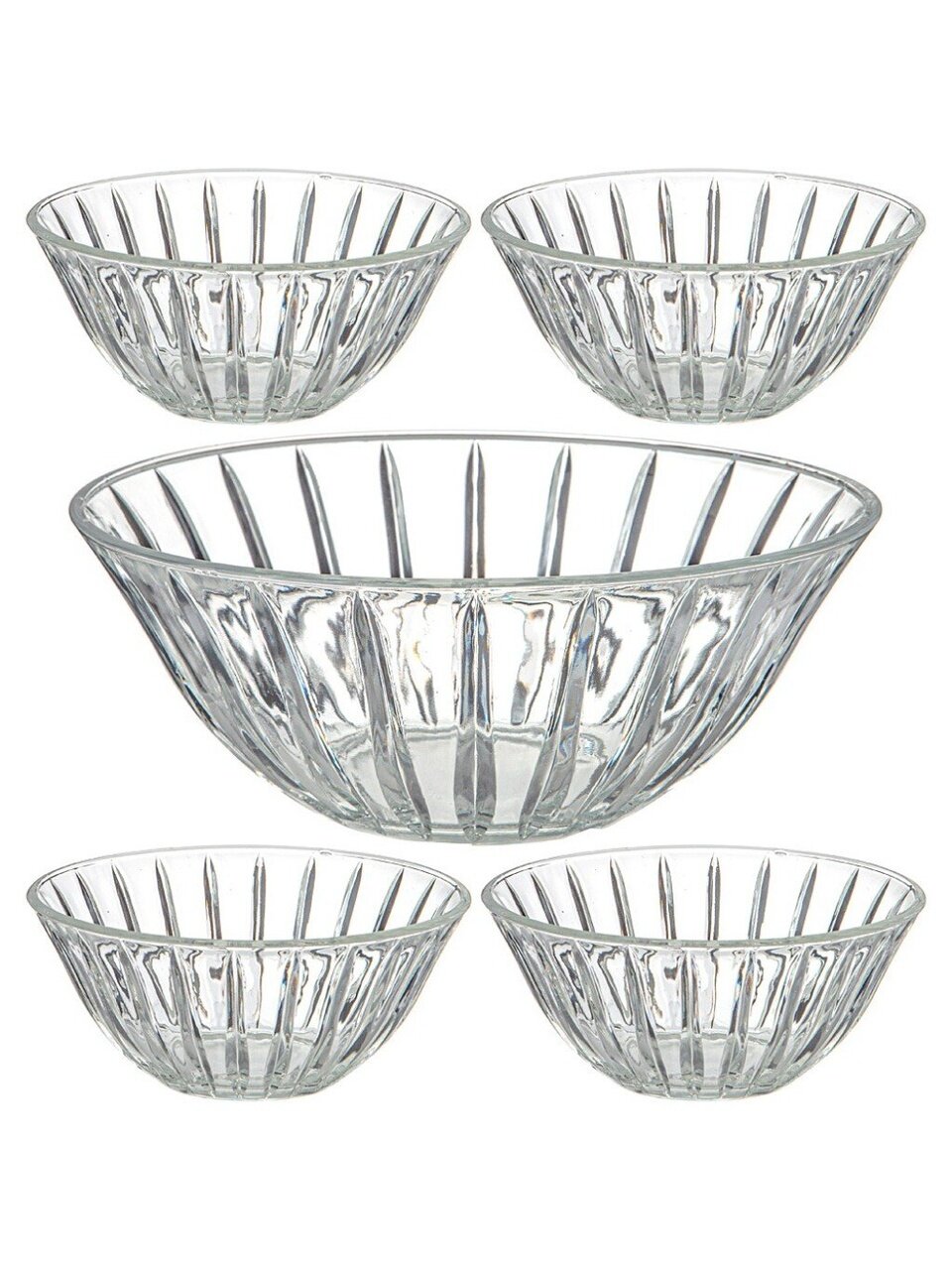 - Практичный набор: 5 салатников разных объёмов (1.6 л и 0.3 л) из прочного стекла, устойчивого к царапинам и перепадам температуры.