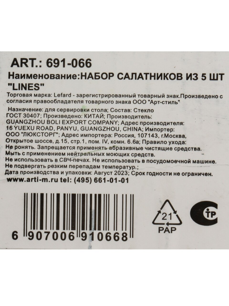 Стильный набор салатников Lefard Lines: 5 прочных стеклянных мисок (1.6 л и 0.3 л) — универсальное решение для сервировки и хранения без переплат.