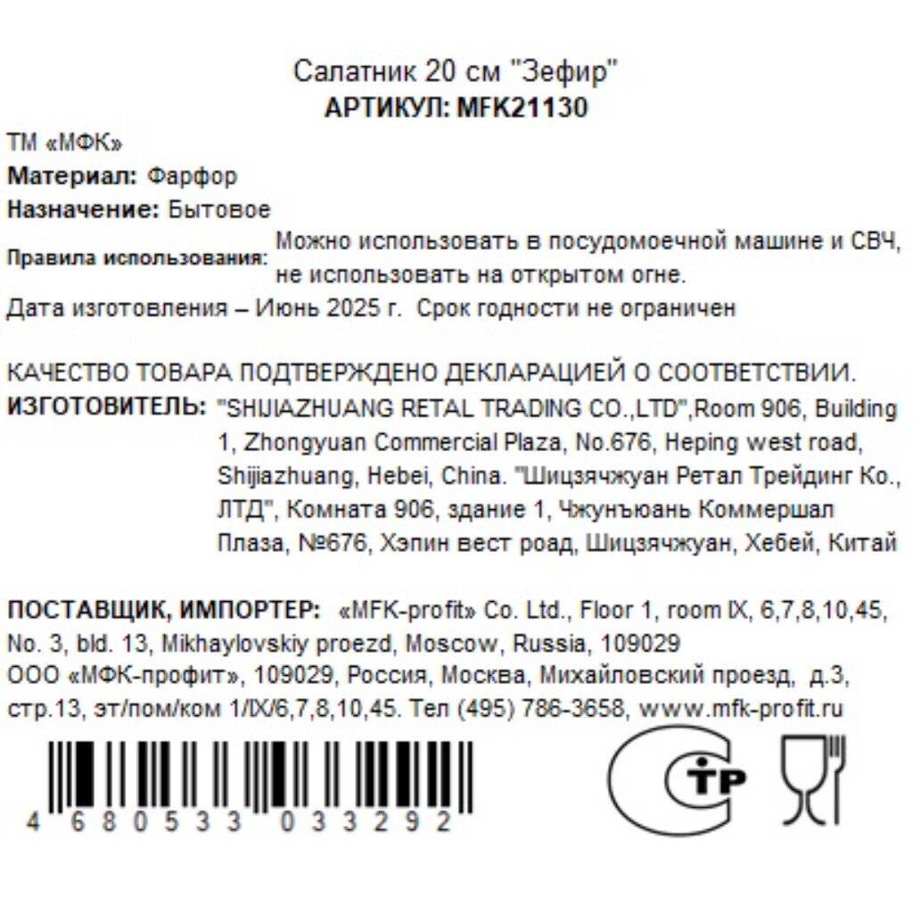 Салатник выполнен из прочного фарфора коллекции «МФК Зефир». Фарфор не выделяет вредных веществ, не впитывает запахи и полностью безопасен для контакта с пищей.