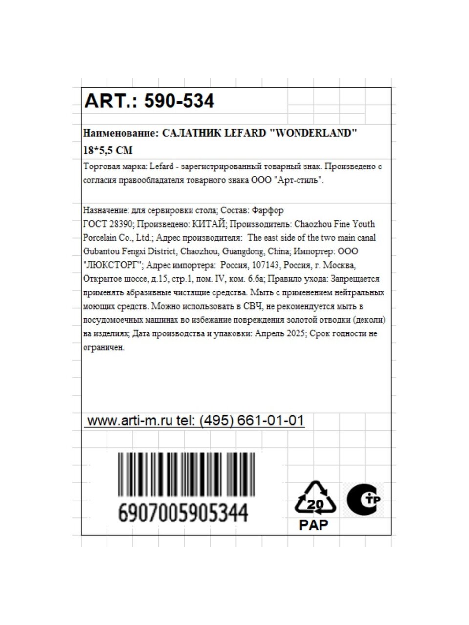 Вы можете приобрести «Салатник фарфор, круглый, 18х5.5 см, подарочная упаковка, Wonderland, Lefard, 590-534» и другие товары в нашем интернет-магазине в Серпухове по низким ценам и с бесплатным самовывозом.