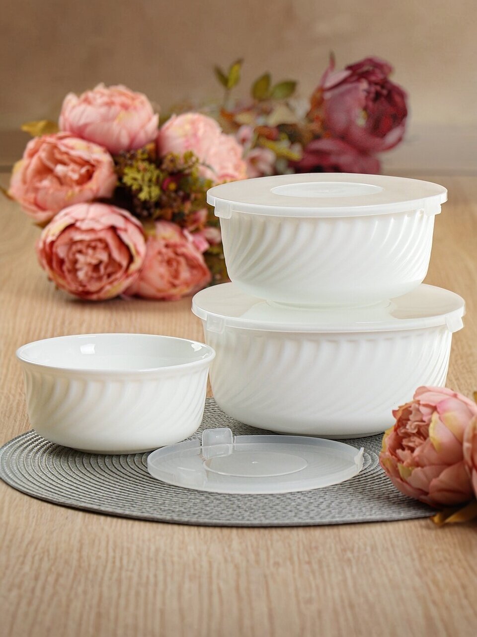 - Трёхразмерный комплект с крышками — удобно для хранения и сервировки разных блюд