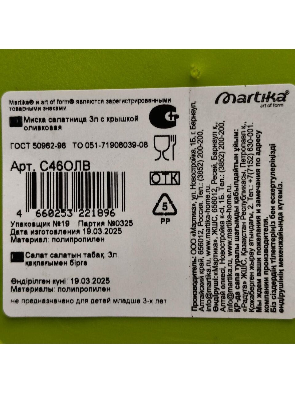 - Оптимальный объем 3 л и компактные размеры (высота 12.6 см, диаметр 25.5 см) — удобно использовать для салатов, теста, маринадов