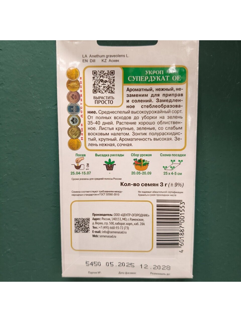 Ароматный, нежный, незаменим для приправ и солений. Среднеспелый высокоурожайный сорт. От полных всходов до срезки на зелень 35-40 дней, до цветения 70-105 дней. Растение хорошо облиственное. Листья крупные, зеленые, со слабым восковым налетом. Зонтик полураскидистый, крупный.