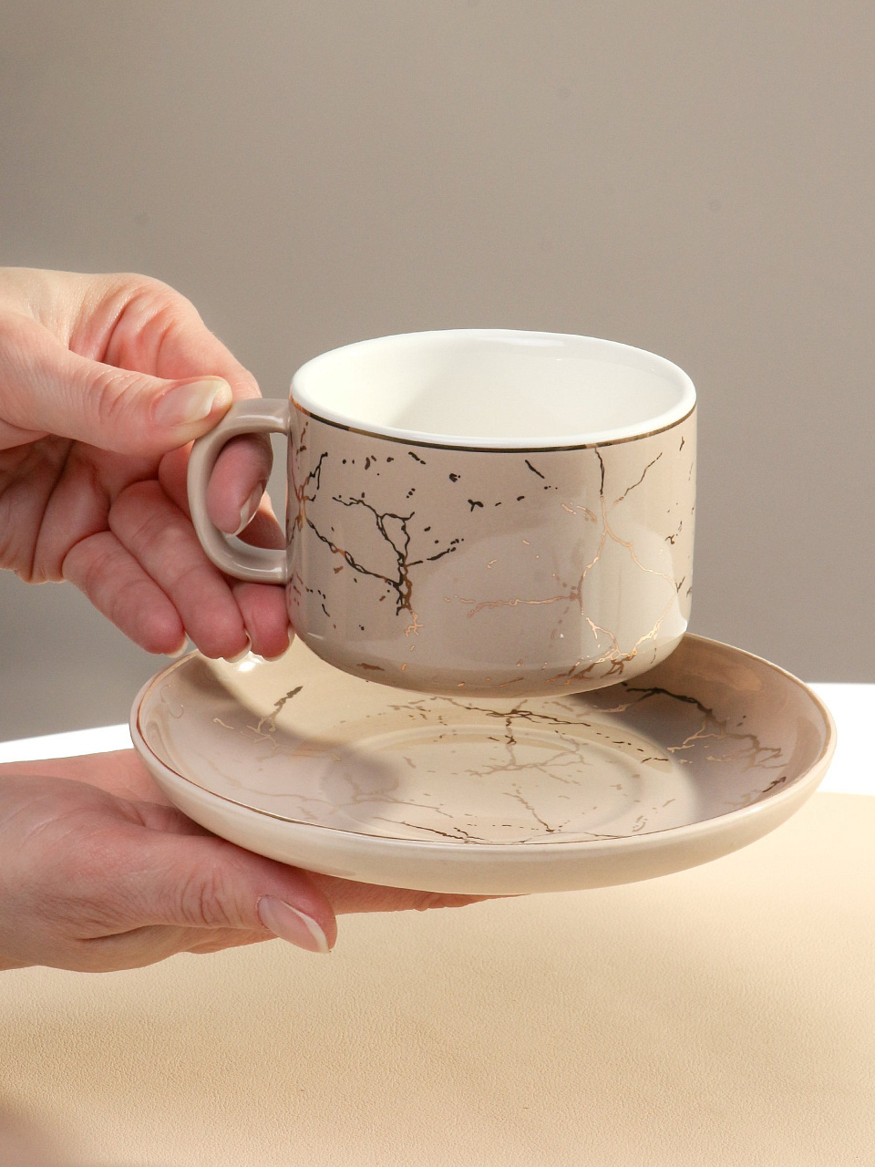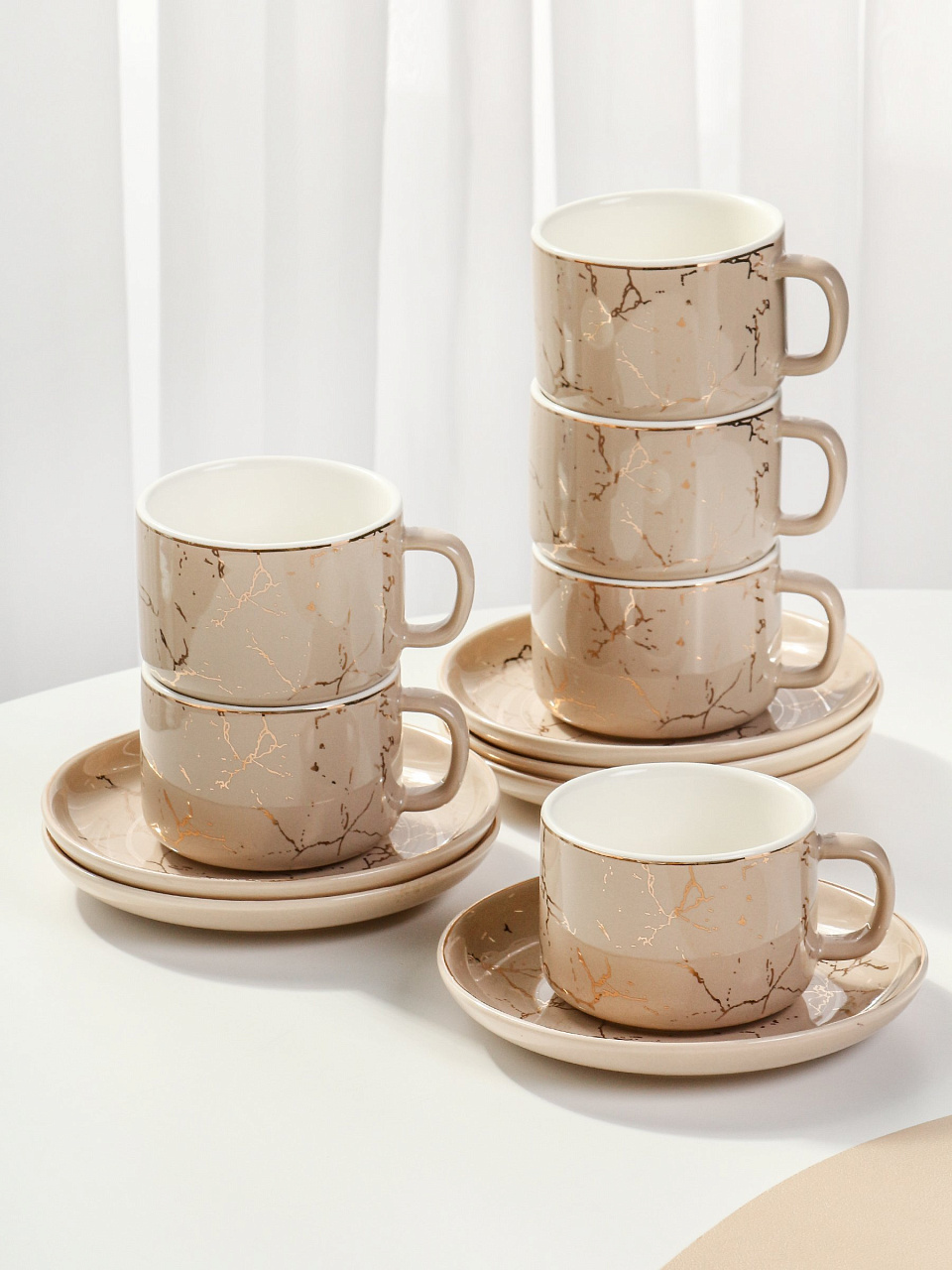 Элегантный чайный набор из керамики на 6 персон (12 предметов, 200 мл), стиль «Бежевый мрамор» с золотой каймой — лучший выбор для подарка и уютных встреч.