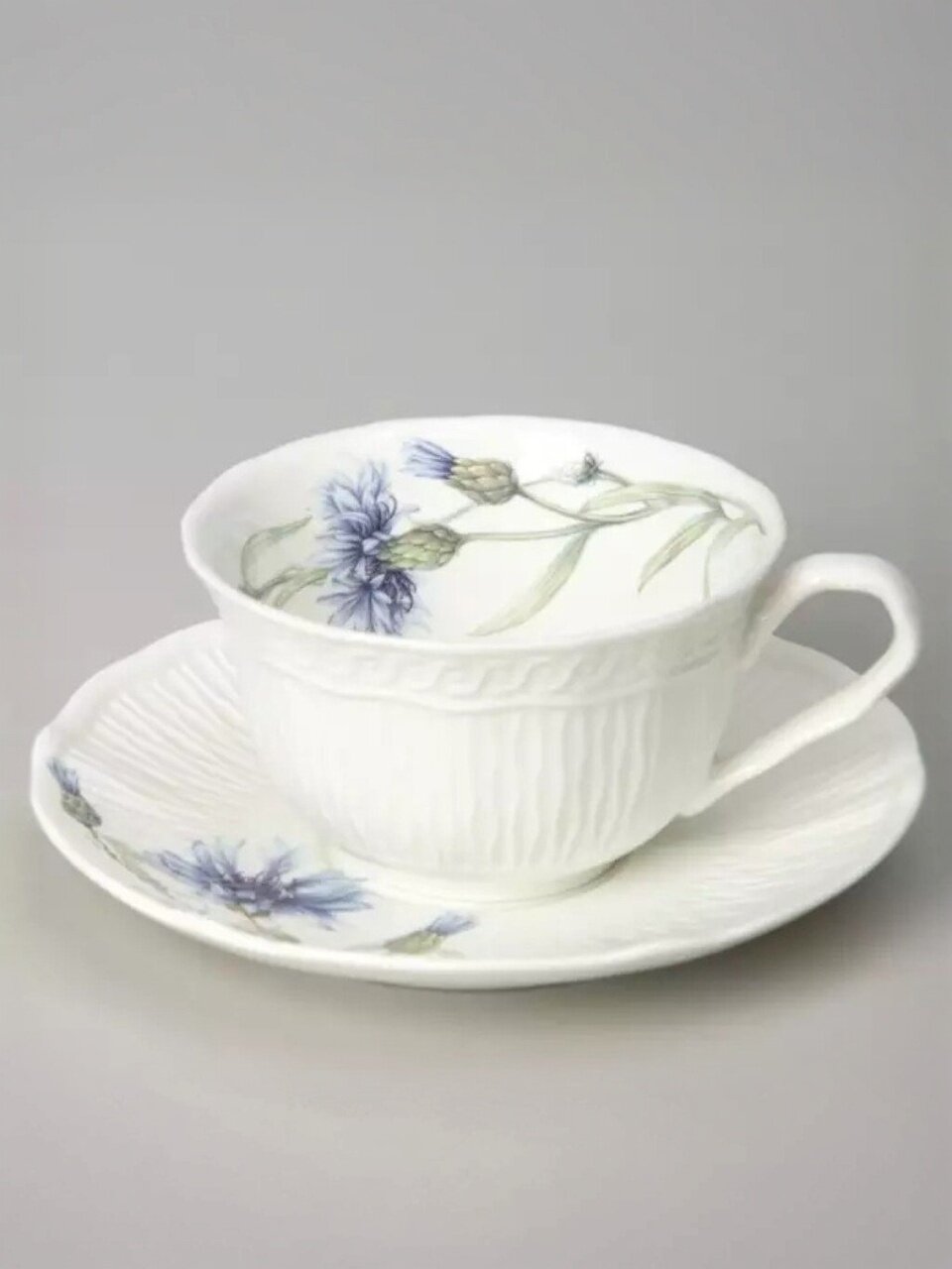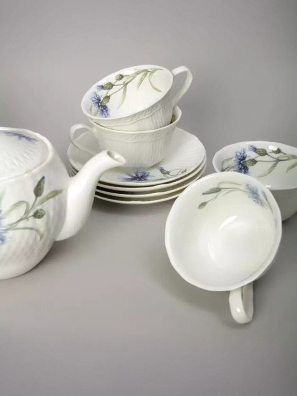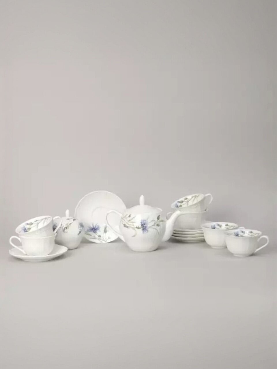 - Эксклюзивный дизайн с цветочным рисунком: каждый предмет сервиза украшен нежными васильками, создавая атмосферу уюта и праздника