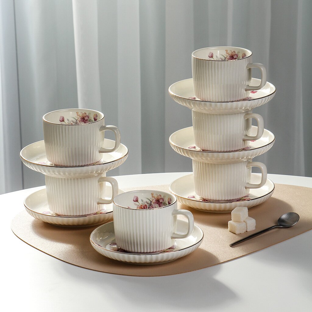 В наборе 12 предметов: 6 чашек объёмом 230 мл (размер 8.5х6.5 см) и 6 блюдец диаметром 15 см.