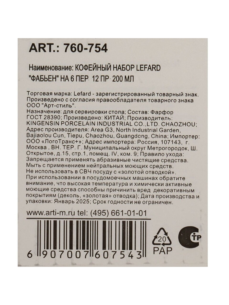 Кофейный сервиз Lefard Фабьен на 6 персон: 12 предметов из фарфора с цветочным рисунком, в подарочной упаковке — стильный выбор для дома и подарка.