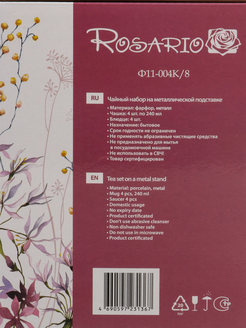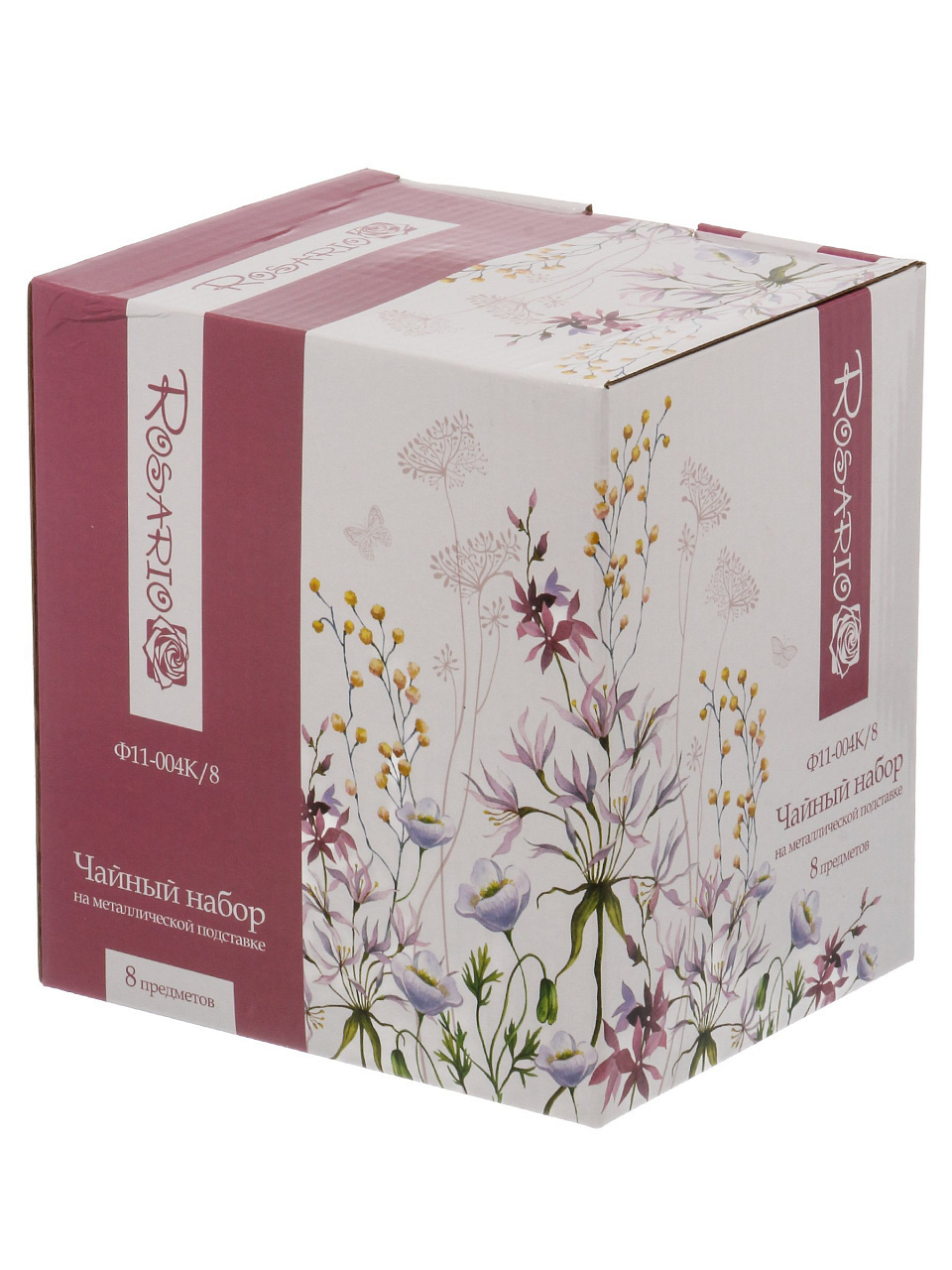 Чайный набор Rosario «Любовь» на 4 персоны — элегантный фарфор с цветочным рисунком, подарочная упаковка и металлическая подставка для стильного чаепития дома и на даче.