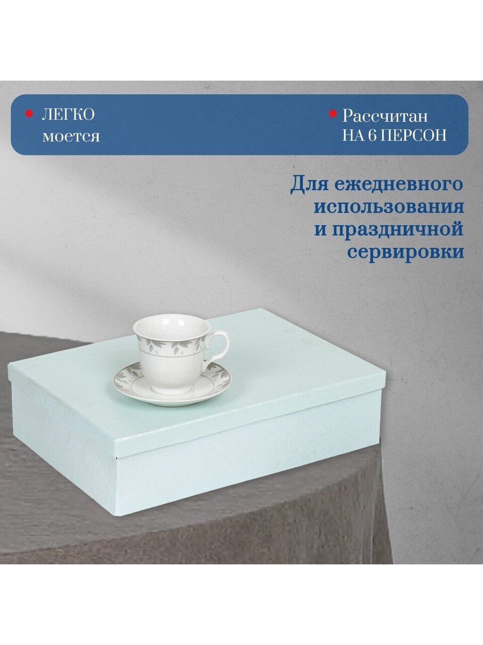 - Прочные керамические чашки и блюдца объёмом 230 мл — подходят для посудомоечной машины и СВЧ, легко очищаются