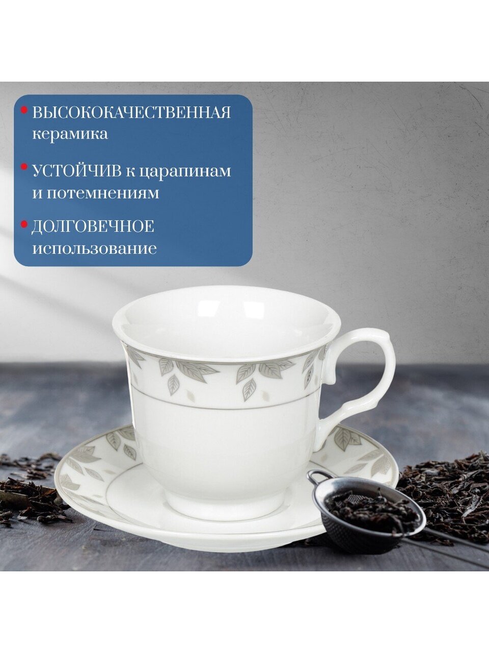 Чайный сервиз «Серебряные листья» — это идеальное решение для тех, кто ищет, какой чайный набор выбрать для уютных встреч или в подарок. Керамика сохраняет тепло напитка, а современный дизайн с серебряным рисунком гармонично впишется в любой интерьер. Комплект рассчитан на 6 персон: вы получаете 12 предметов (чашки и блюдца), что удобно для семейных встреч или гостей.