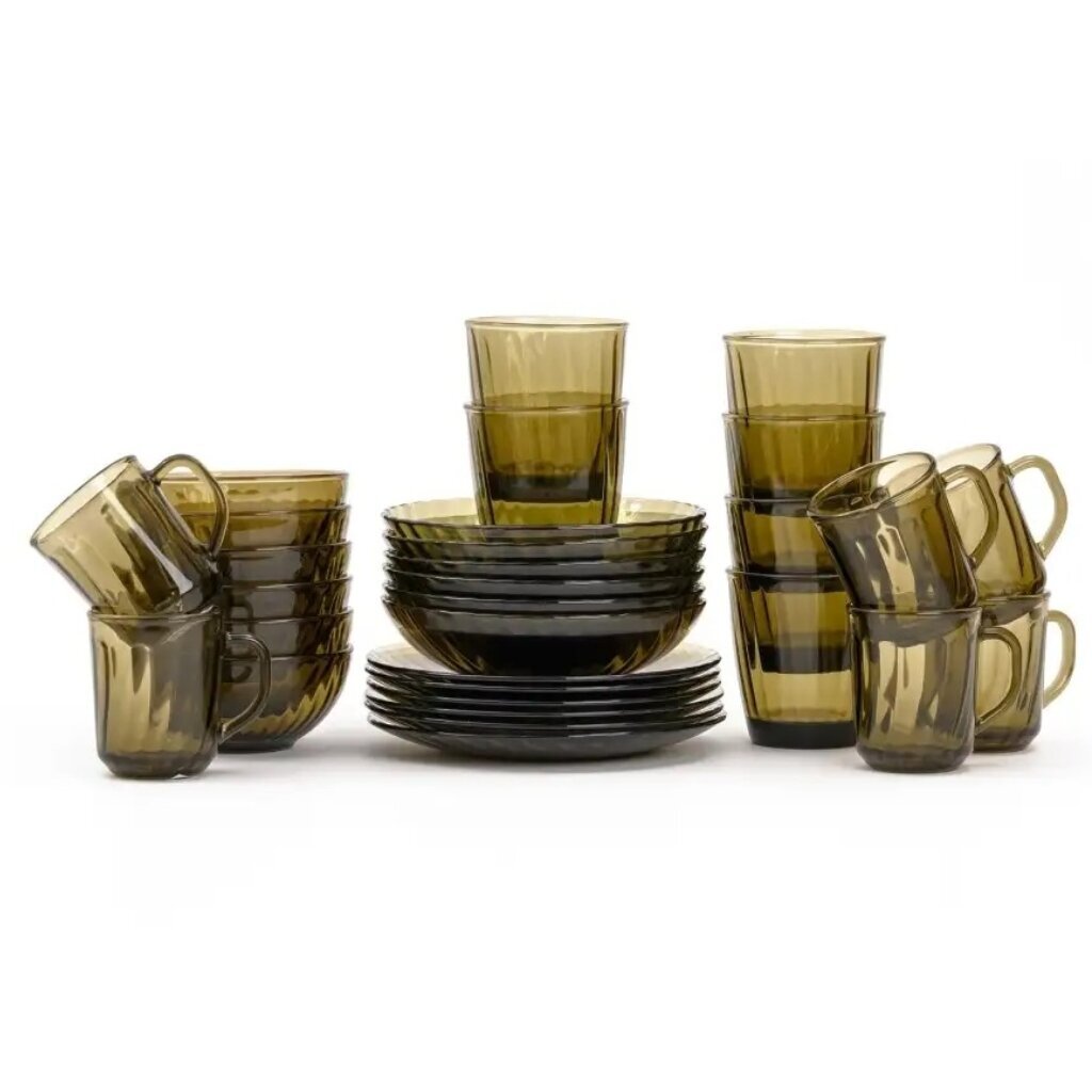 Изящный столовый сервиз из прозрачного дымчатого стекла — практичный подарок и выгодное приобретение. Посуда отлично подходит для ежедневного использования.