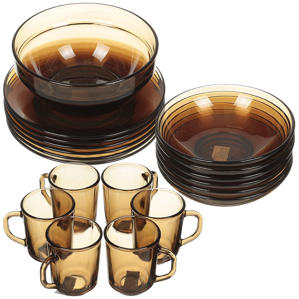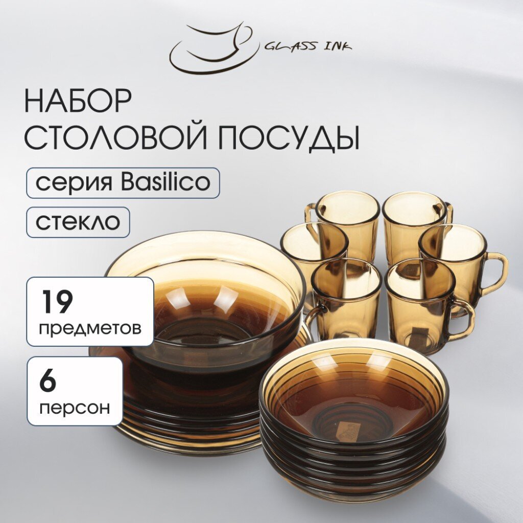 Изящный столовый сервиз Basilico из прозрачного дымчатого стекла — отличный подарок и выгодное приобретение. Набор посуды из стекла отличается практичностью и эффектным внешним видом. Сервиз прекрасно подойдёт для повседневного использования и праздничных мероприятий.