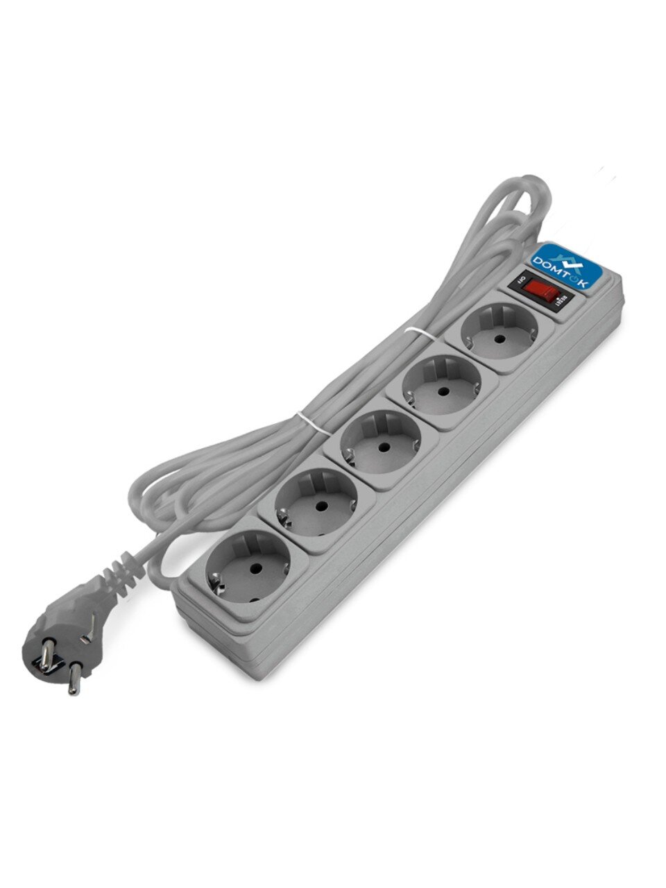 Сетевой фильтр 5 гнезд, 5 м, ПВС, 3х1 мм², с заземлением, 10 А, выключатель с индикацией, серый, Domtok, 2534