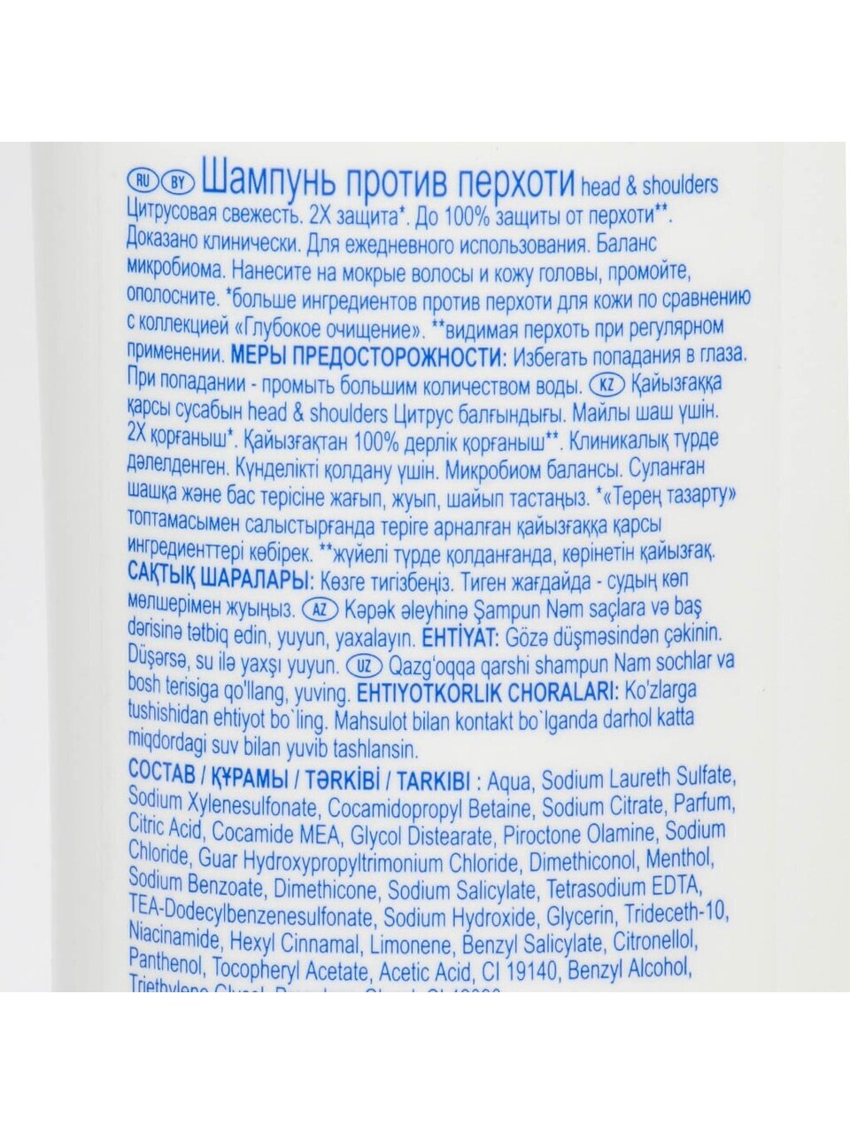 Head & Shoulders — это выбор для тех, кто стремится к безупречной чистоте волос и уверенности в себе. Аромат цитрусовой свежести наполняет каждое мытье бодрящей энергией, создавая атмосферу легкости и комфорта. Продукт разработан для всех типов волос, что делает его универсальным решением для любого члена семьи. Благодаря уникальному сочетанию компонентов, шампунь помогает поддерживать естественный баланс кожи головы и способствует ощущению свежести на протяжении всего дня.