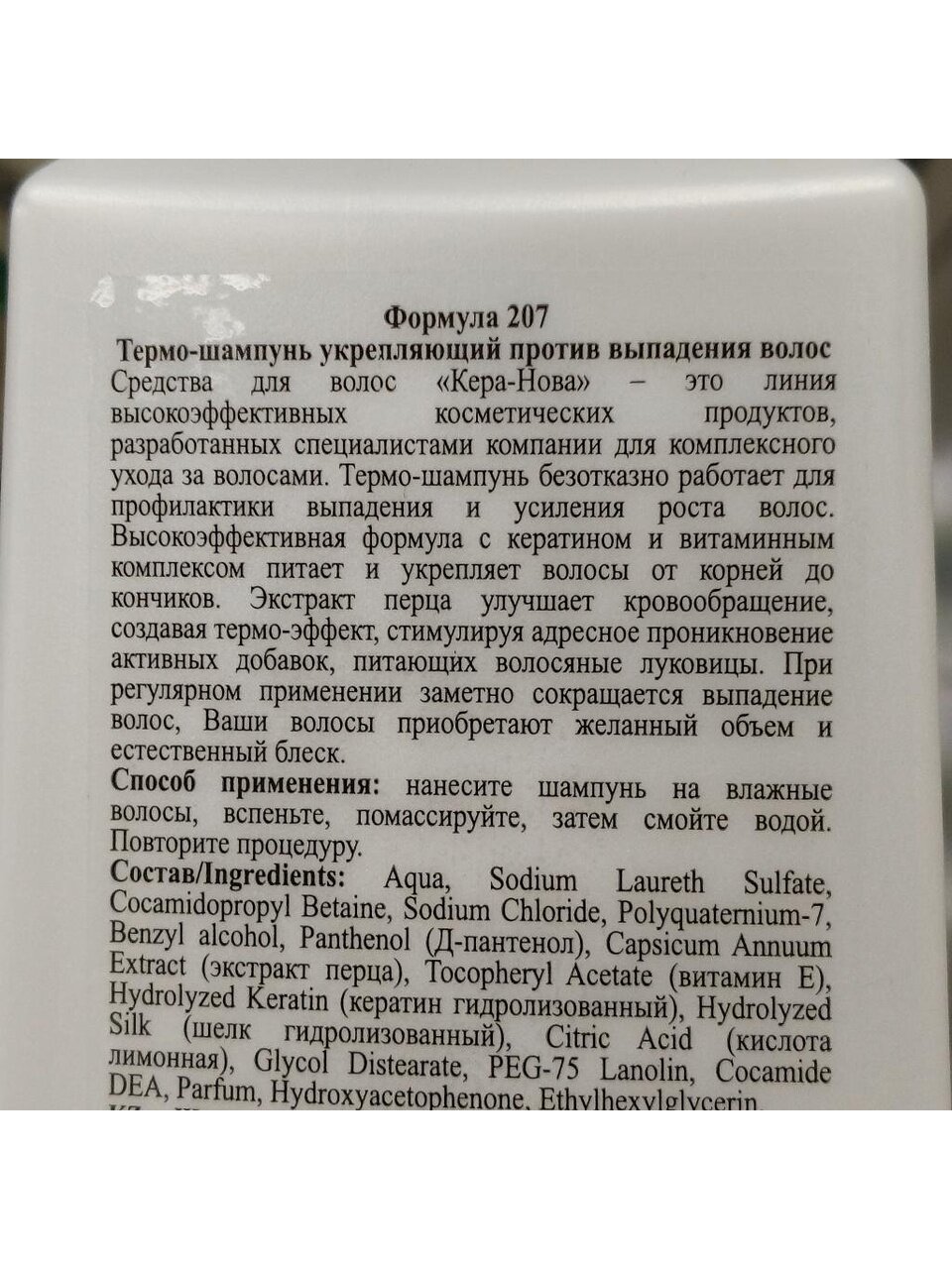Средства для волос «Кера-Нова» - это линия высокоэффективных косметических продуктов, разработанных специалистами компании для комплексного ухода за волосами. Термо-шампунь безотказно работает для профилактики выпадения и усиления роста волос. Высокоэффективная формула с кератином и витаминным комплексом питает и укрепляют волосы от корней до кончиков. Экстракт перца улучшает кровообращение, создавая термо-эффект, стимулируя адресное проникновение активных добавок, питающих волосяные луковицы. При регулярном применении заметно сокращается выпадение волос, Ваши волосы приобретают желанный объем и естественный блеск.