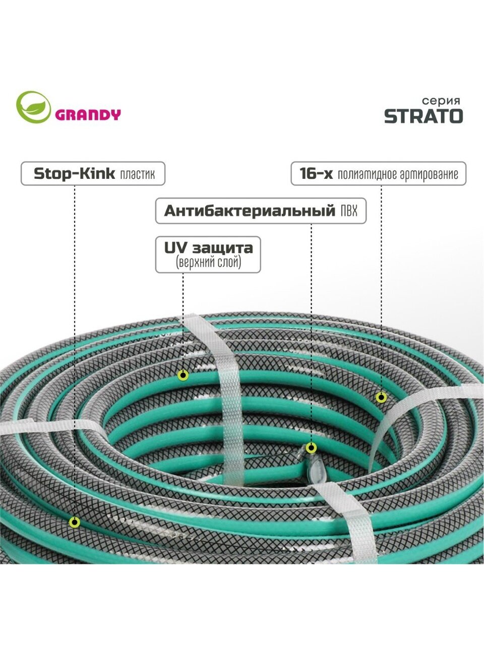 Идеальная форма шланга достигается благодаря неповторимой технологии армирования: нити располагаются под углом к горизонтали, что позволяет сохранить идеальный диаметр и длину изделия, предотвращая перекручивание и перегиб. Трехслойные стенки гарантируют долгую службу и безопасность использования на протяжении всего жизненного цикла шланга.