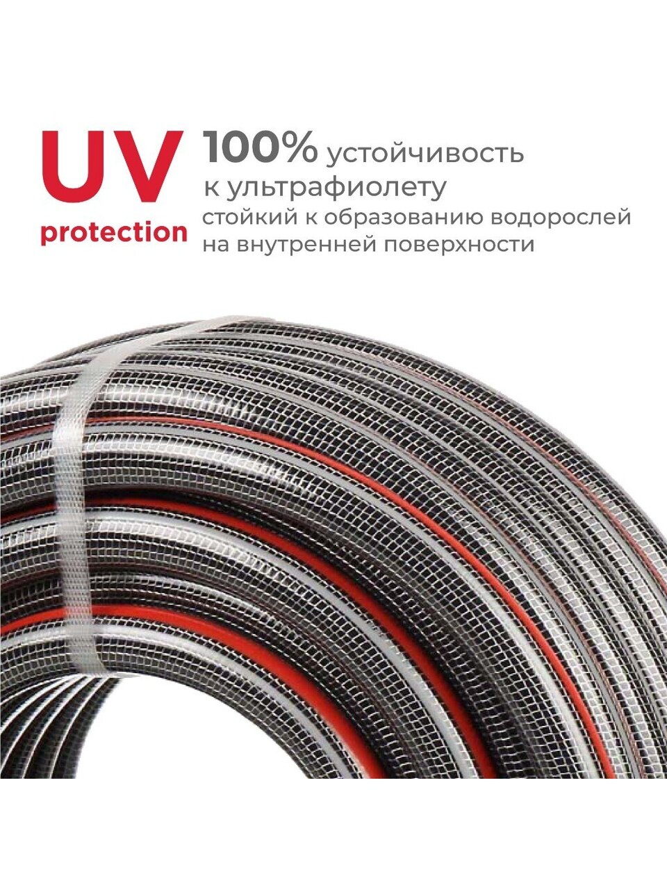 Шланг имеет внутренний диаметр 20 мм и длину 25 метров, что делает его идеальным выбором для полива больших участков. Изготовленный из прочного ПВХ материала, он обладает высокой устойчивостью к ультрафиолетовому излучению и защите от образования водорослей на внутреннем слое. Это обеспечивает долговечность и надежность в эксплуатации даже в самых сложных условиях.