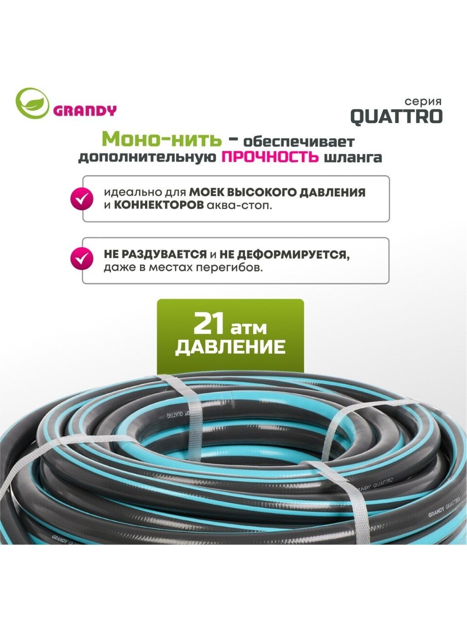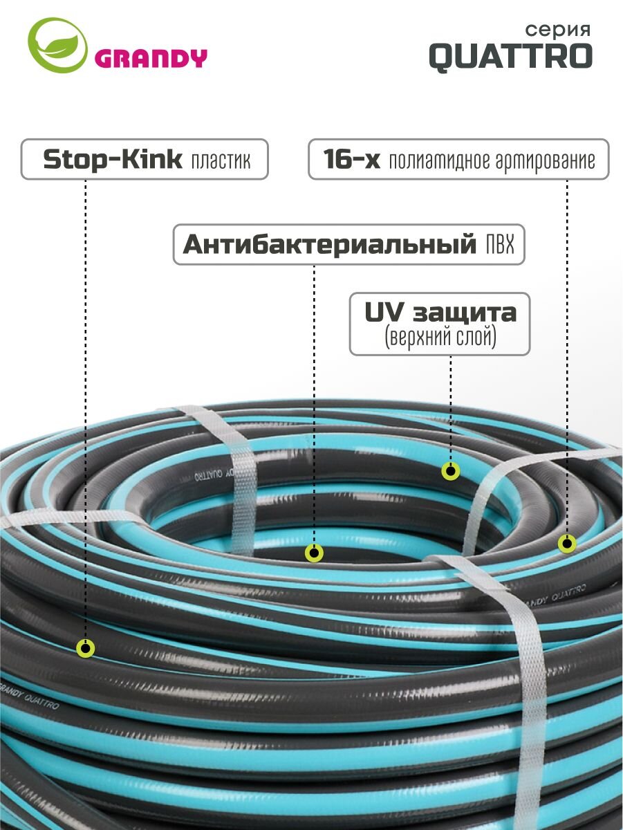 Шланг Grandy Quattro используется для поливочных работ на садово-огородных участках. Четырехслойный. Он выполнен из высококачественного первичного ПВХ, что делает его прочным и долговечным. Благодаря армированию прочной полиэсторовой нитью, шланг устойчив к механическому воздействию и перегибам.