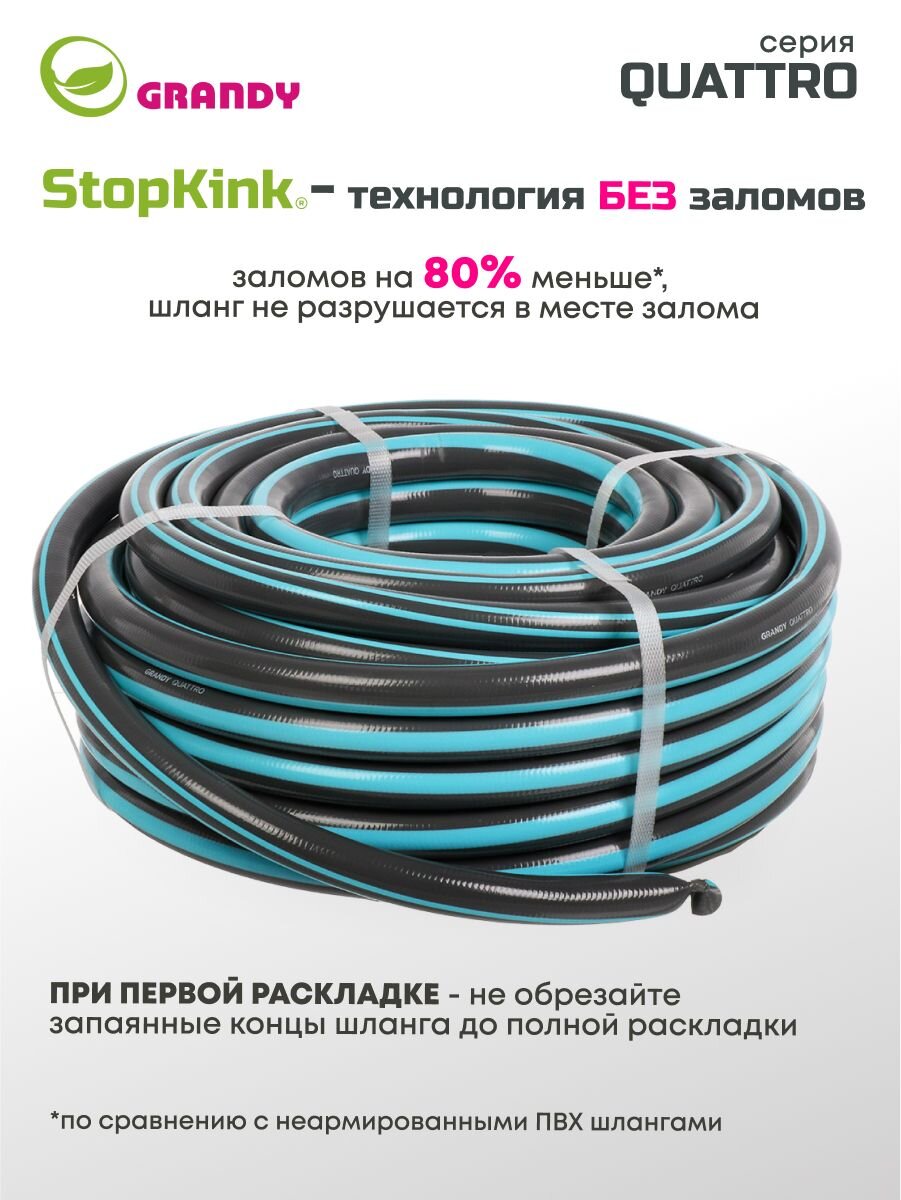 Шланг поливочный армированный Grandy Quattro не подвержен локальным вздутиям, не образует трещин и изломов. Проверен на герметичность, концы шланга запаяны под давлением.