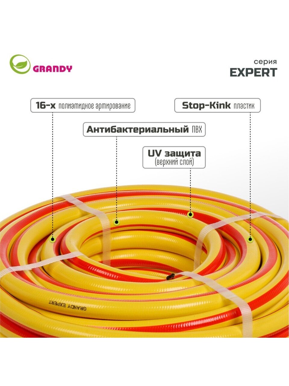 Шланг поливочный армированный Grandy Expert не подвержен локальным вздутиям, не образует трещин и изломов. Проверен на герметичность, концы шланга запаяны под давлением.