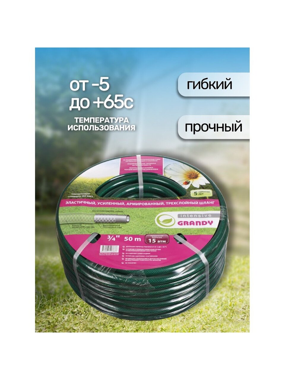 Шланг поливочный армированный Grandy Intensive не подвержен локальным вздутиям, не образует трещин и изломов. Проверен на герметичность, концы шланга запаяны под давлением.