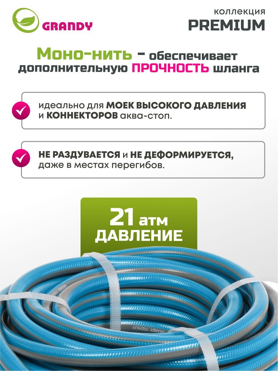 Шланг поливочный армированный Grandy Premium не подвержен локальным вздутиям, не образует трещин и изломов. Проверен на герметичность, концы шланга запаяны под давлением.