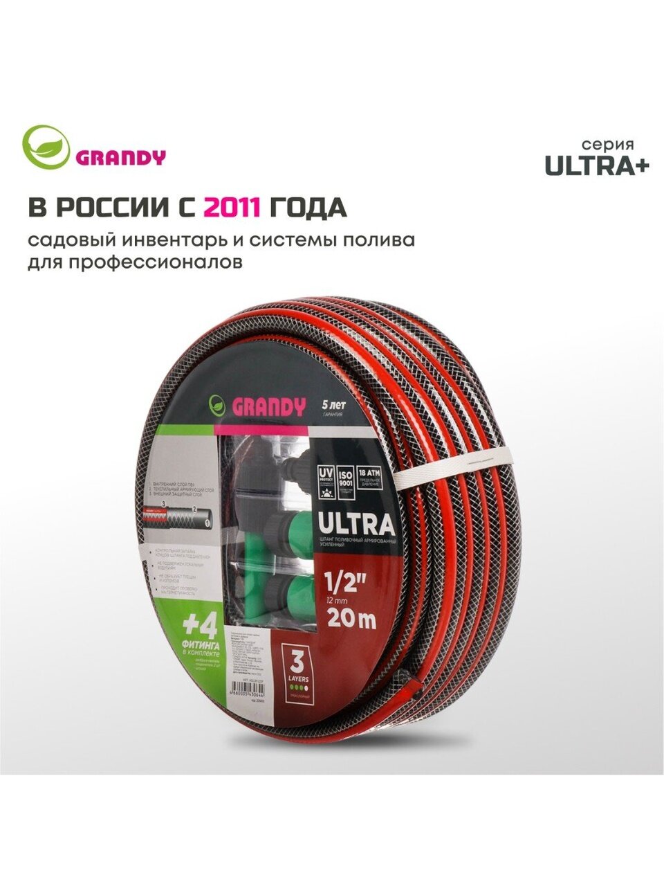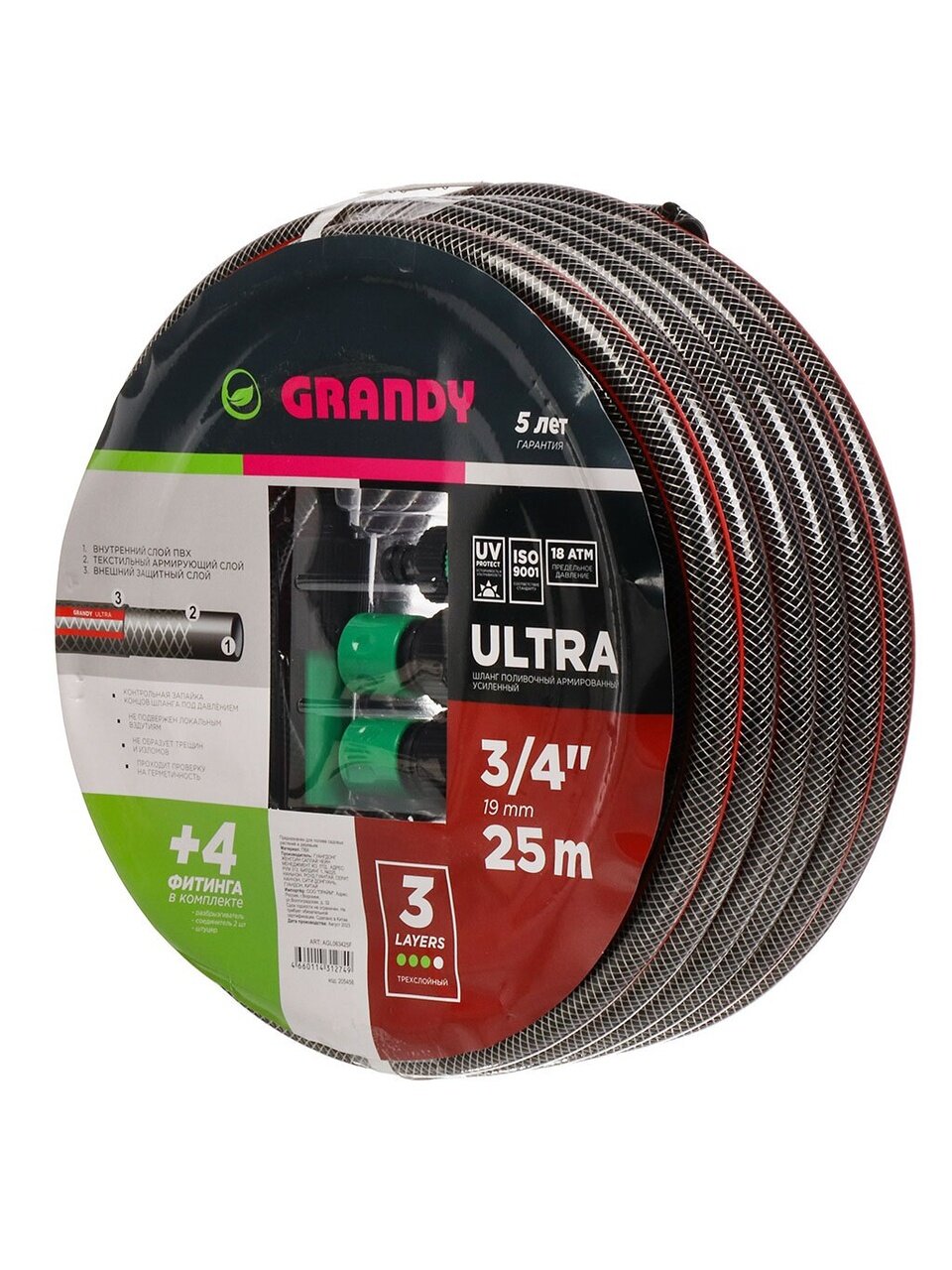 Шланг поливочный армированный трехслойный Grandy Ultra+ не подвержен локальным вздутиям, не образует трещин и изломов. Проверен на герметичность, концы шланга запаяны под давлением. Шланг соответствует стандарту ISO 9001. Устойчив к прямым солнечным лучам и ультрафиолетовому излучению. Устойчив к коррозии и истиранию, не токсичен и не содержит солей кадмия. Не образует водорослей и других наслоений на внутренних поверхностях шланга. Допустимые температурные значения: от -5°С до +65°С. В комплект поставки входят дополнительные фитинги для шланга.