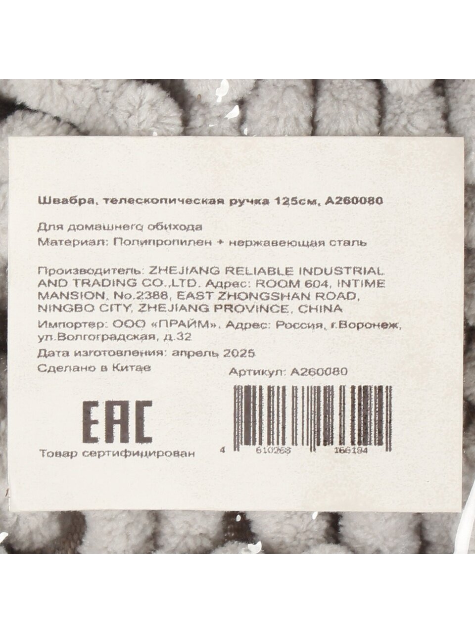 Швабра с телескопической ручкой 125 см A260080 — универсальное решение для быстрой уборки пола, потолков и стен. Оптимальная длина, легкий вес, микрофибра для идеальной чистоты без разводов.