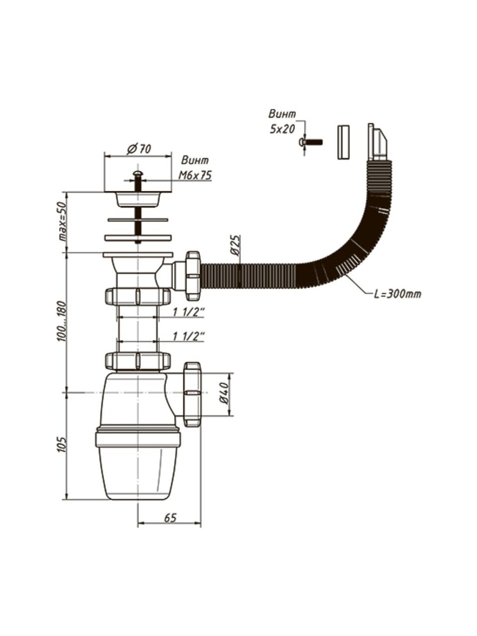 Сифон с большим корпусом и отстойником, прямоугольным переливом, выпуском, нержавеющей чашкой диаметром 70 мм для мойки с прямоугольным переливом. В комплекте две прокладки на перелив - для круглой и прямоугольной формы мойки. Необходим отвод в канализацию.