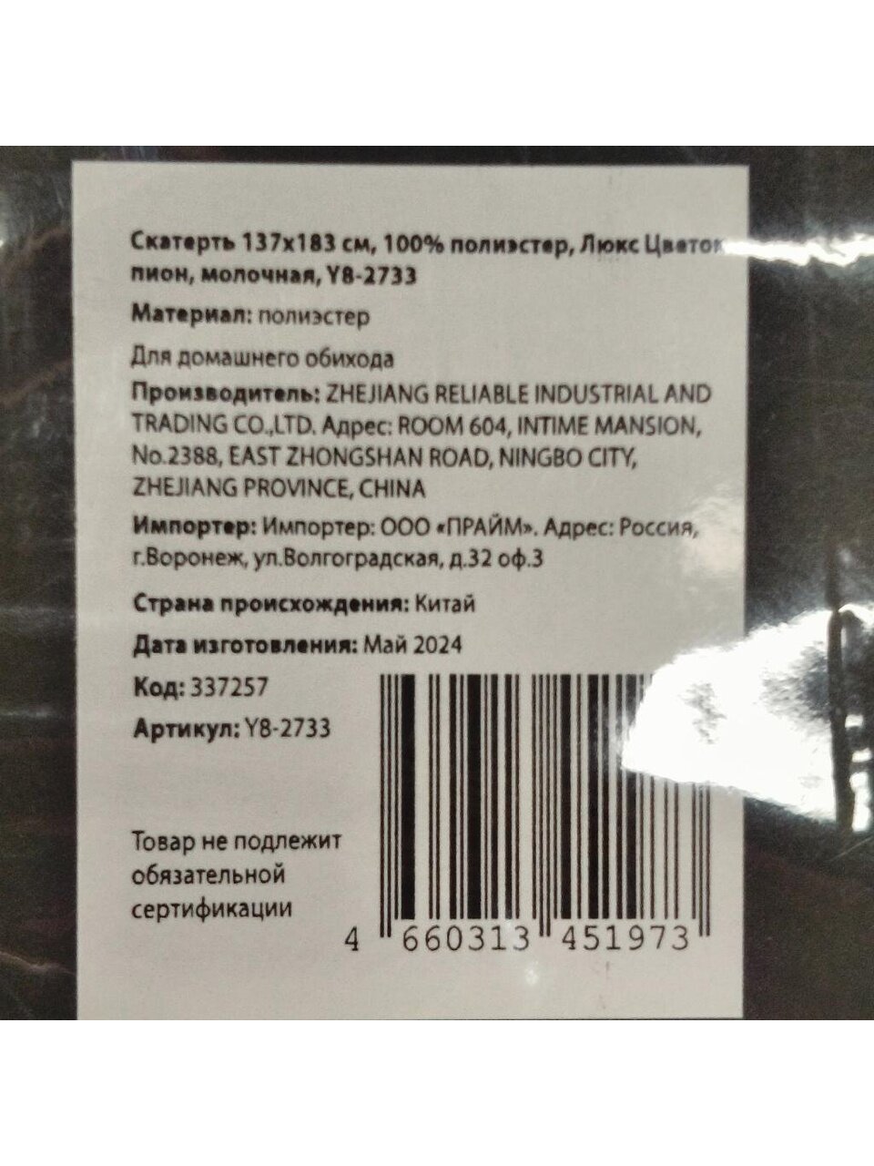Вы можете приобрести «Скатерть 137х183 см, 100% полиэстер, Люкс Цветок пион, молочная, Y8-2733» и другие товары в нашем интернет-магазине в Серпухове по низким ценам и с бесплатным самовывозом.