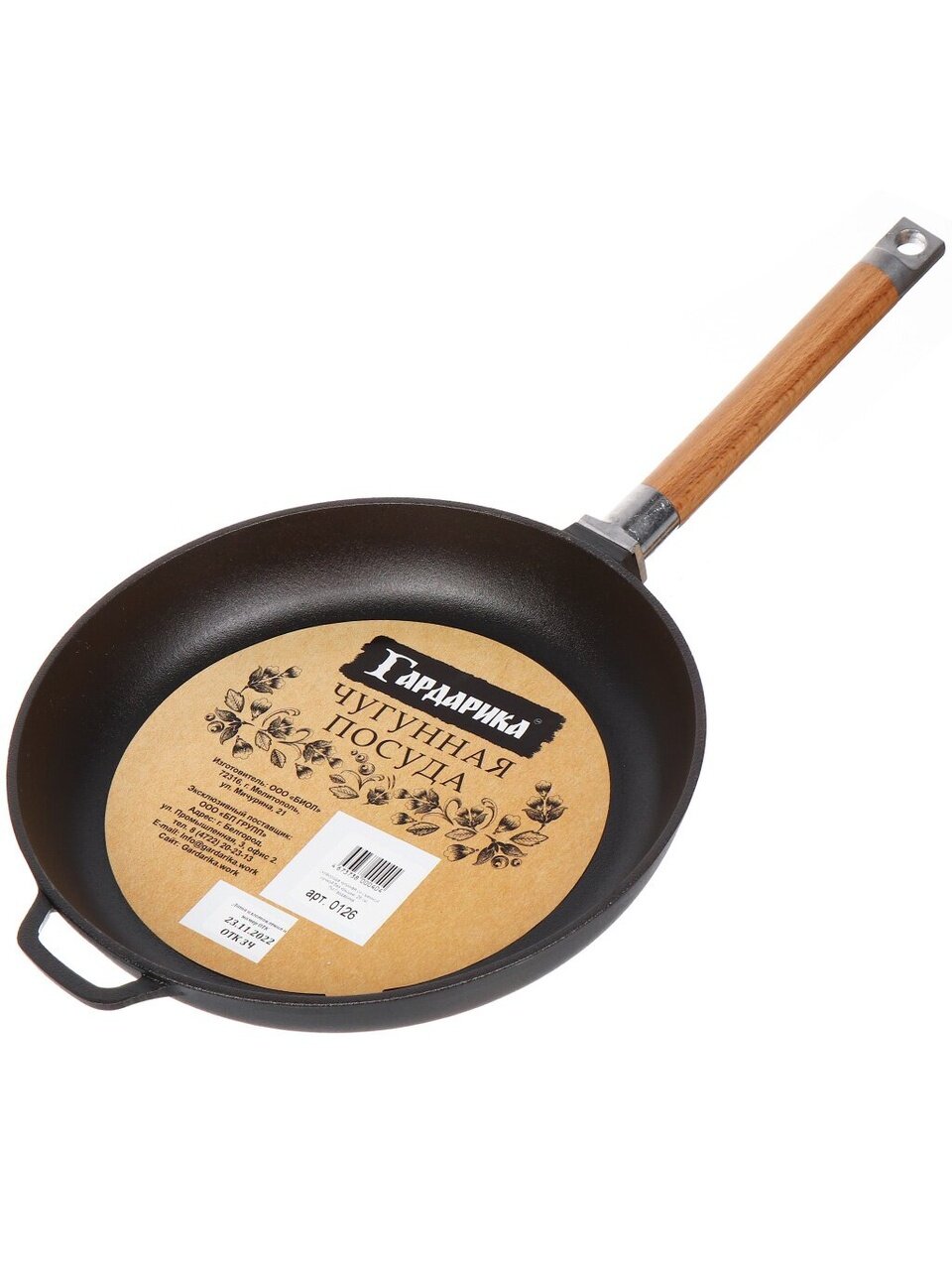 Частый вопрос: чем отличается чугунная сковорода без антипригарного покрытия? Такой вариант безопаснее для здоровья, не боится металлических лопаток, а при правильном уходе формирует естественный антипригарный слой. В отличие от алюминиевых и тонкостенных моделей, чугунная сковорода Гардарика подходит для приготовления на открытом огне и в духовке. Съемная деревянная ручка облегчает хранение и уход.