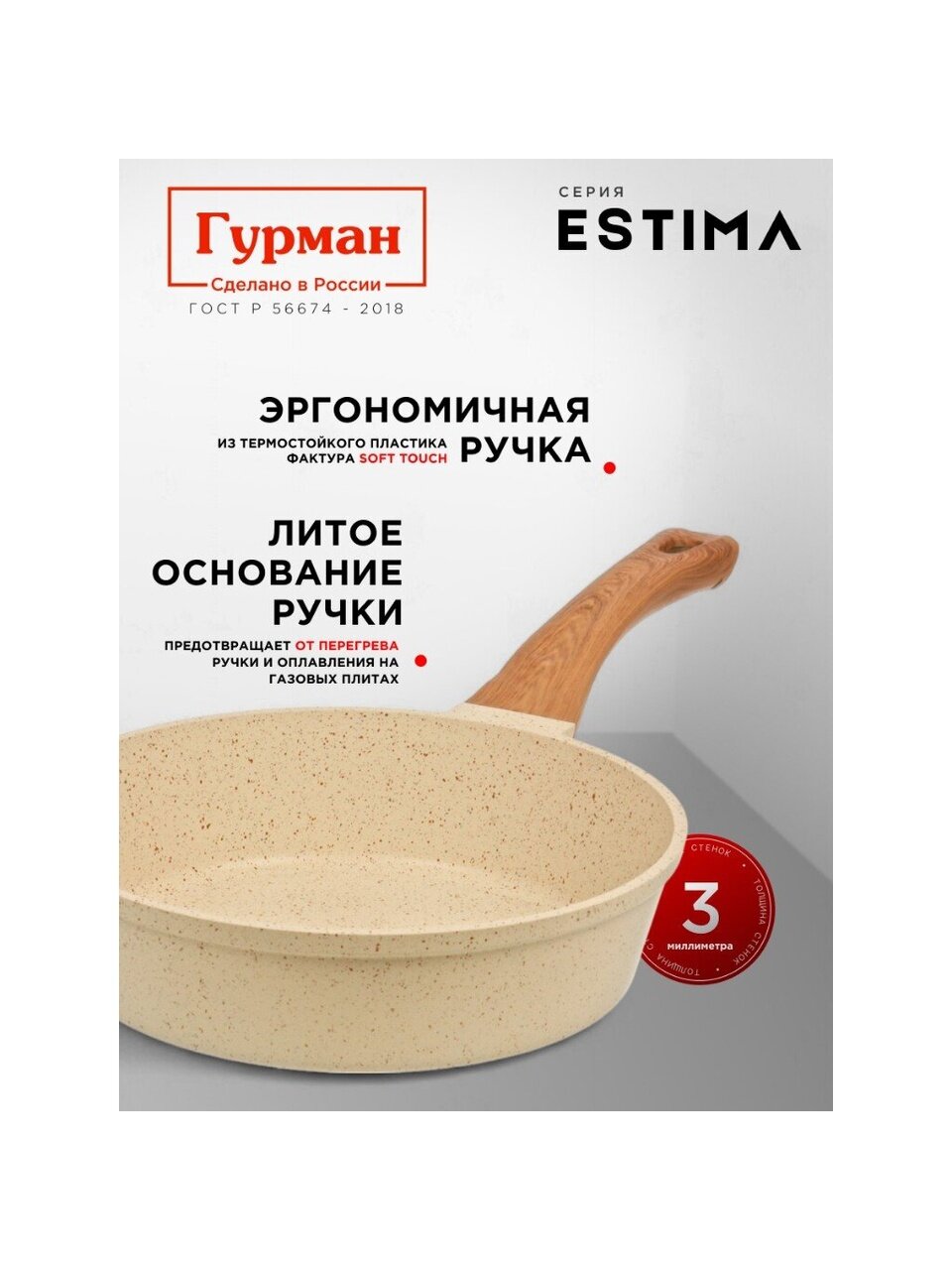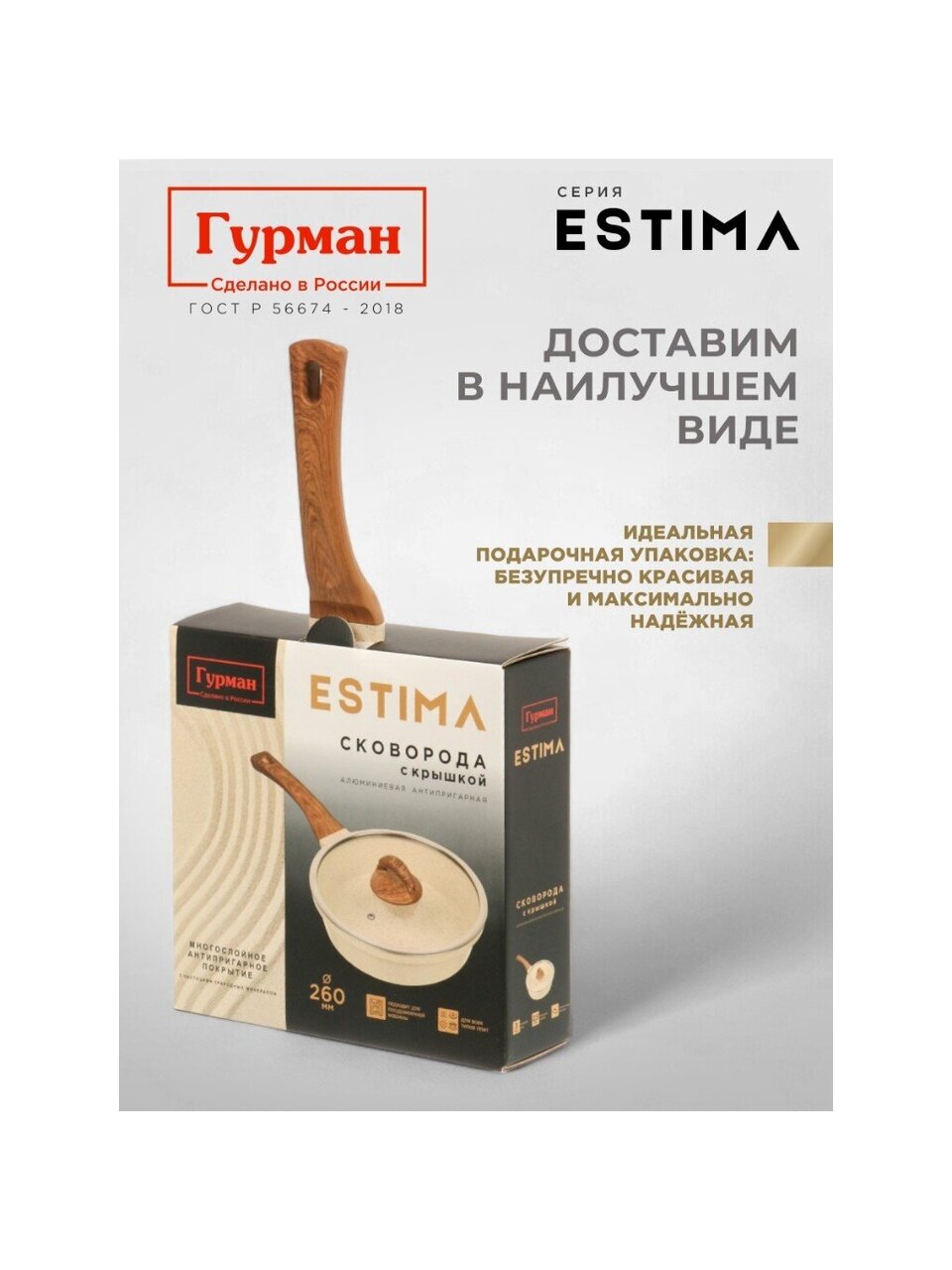 Вы можете приобрести «Сковорода литой алюминий, 26 см, антипригарное покрытие, Гурман, Estima, бежевая, с крышкой, в коробке, индукция, ГМ2602 ЭБИ» и другие товары в нашем интернет-магазине в Липецке по низким ценам и с бесплатным самовывозом.