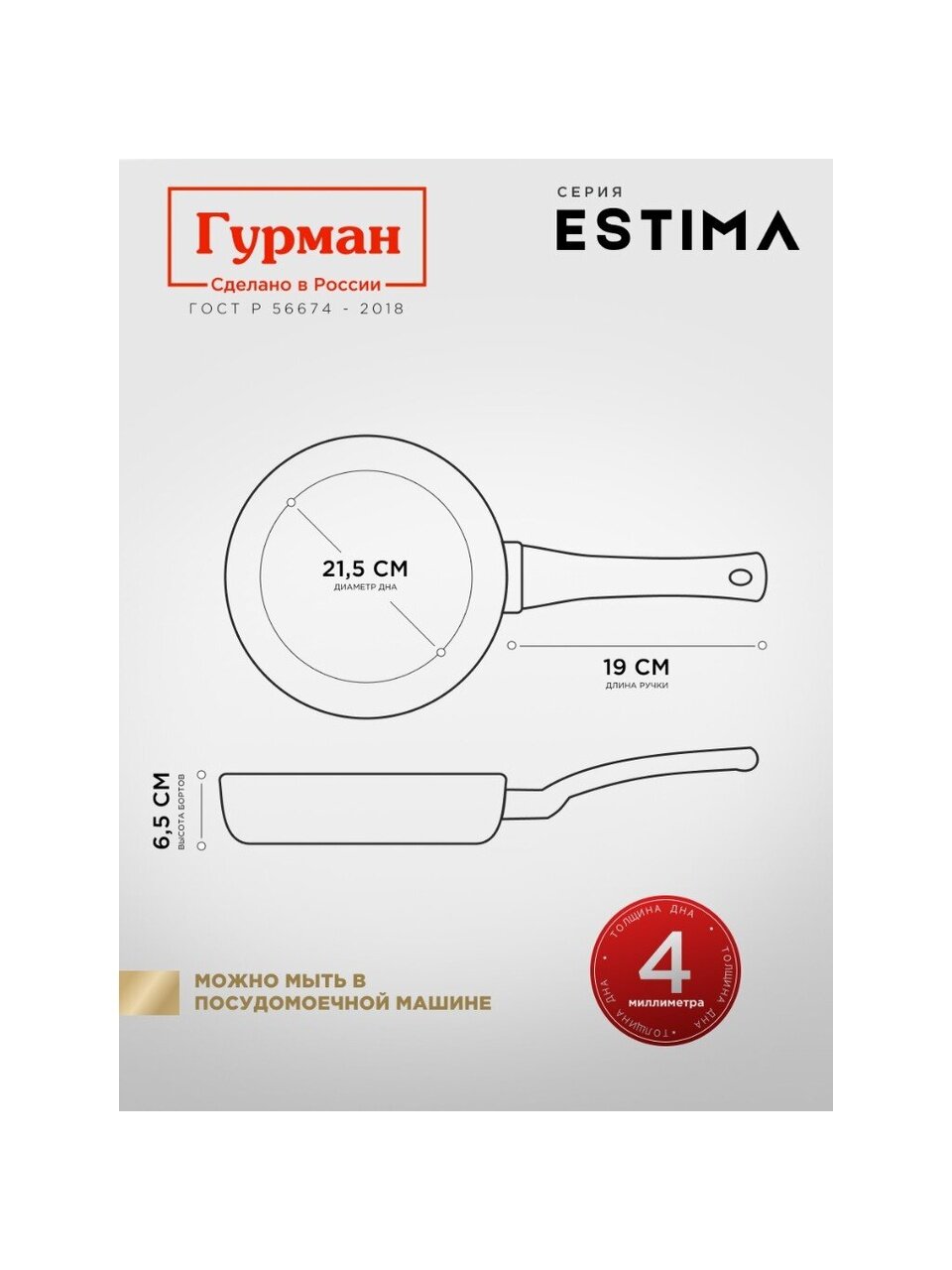 Да, сковорода Гурман Estima подходит для индукционных, газовых, электрических и стеклокерамических плит благодаря специальному дну, диаметр которого — 21,5 см.