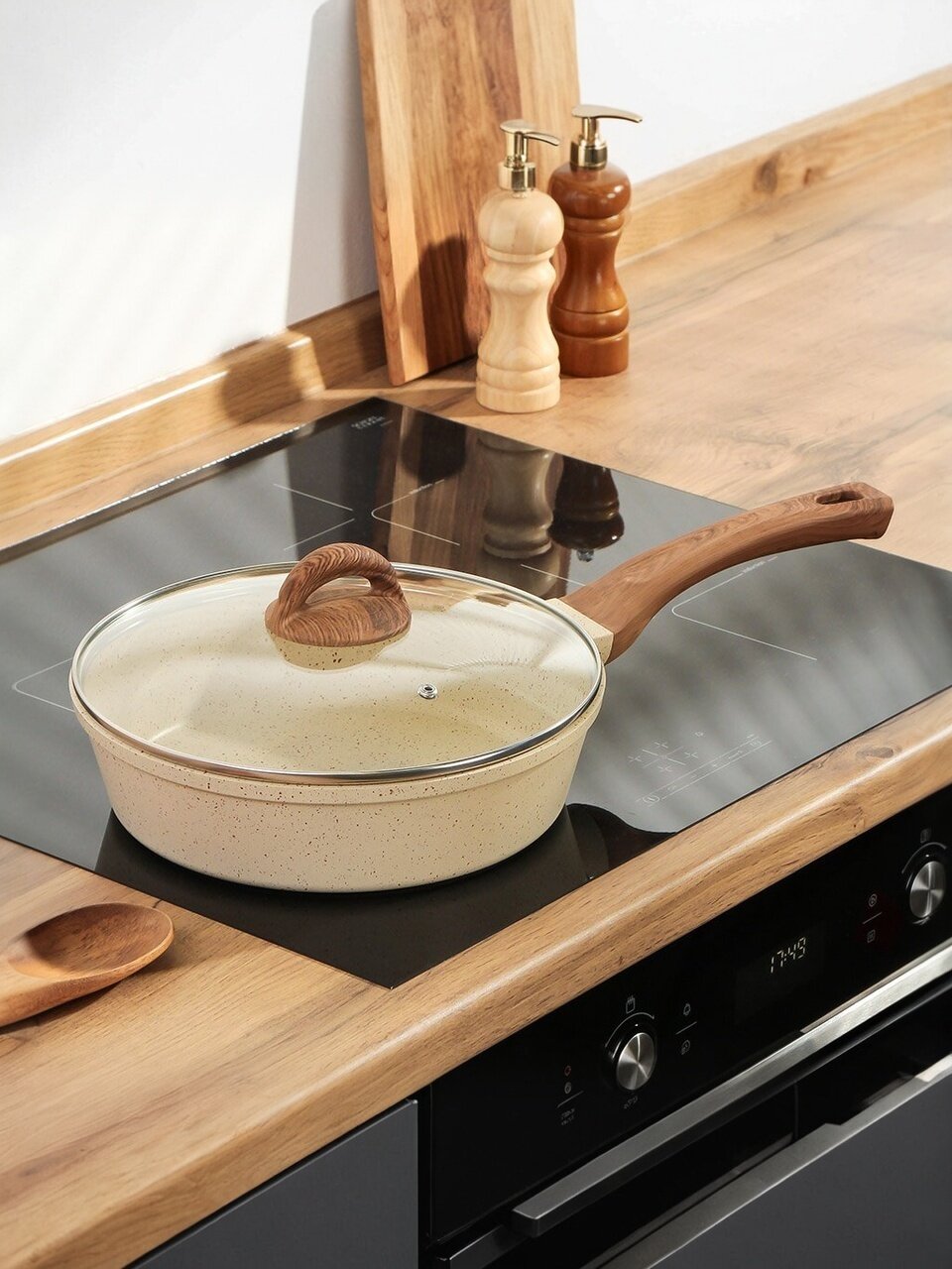- Толстое дно 4 мм и литой алюминий — равномерный нагрев, подходит для всех типов плит, включая индукционные