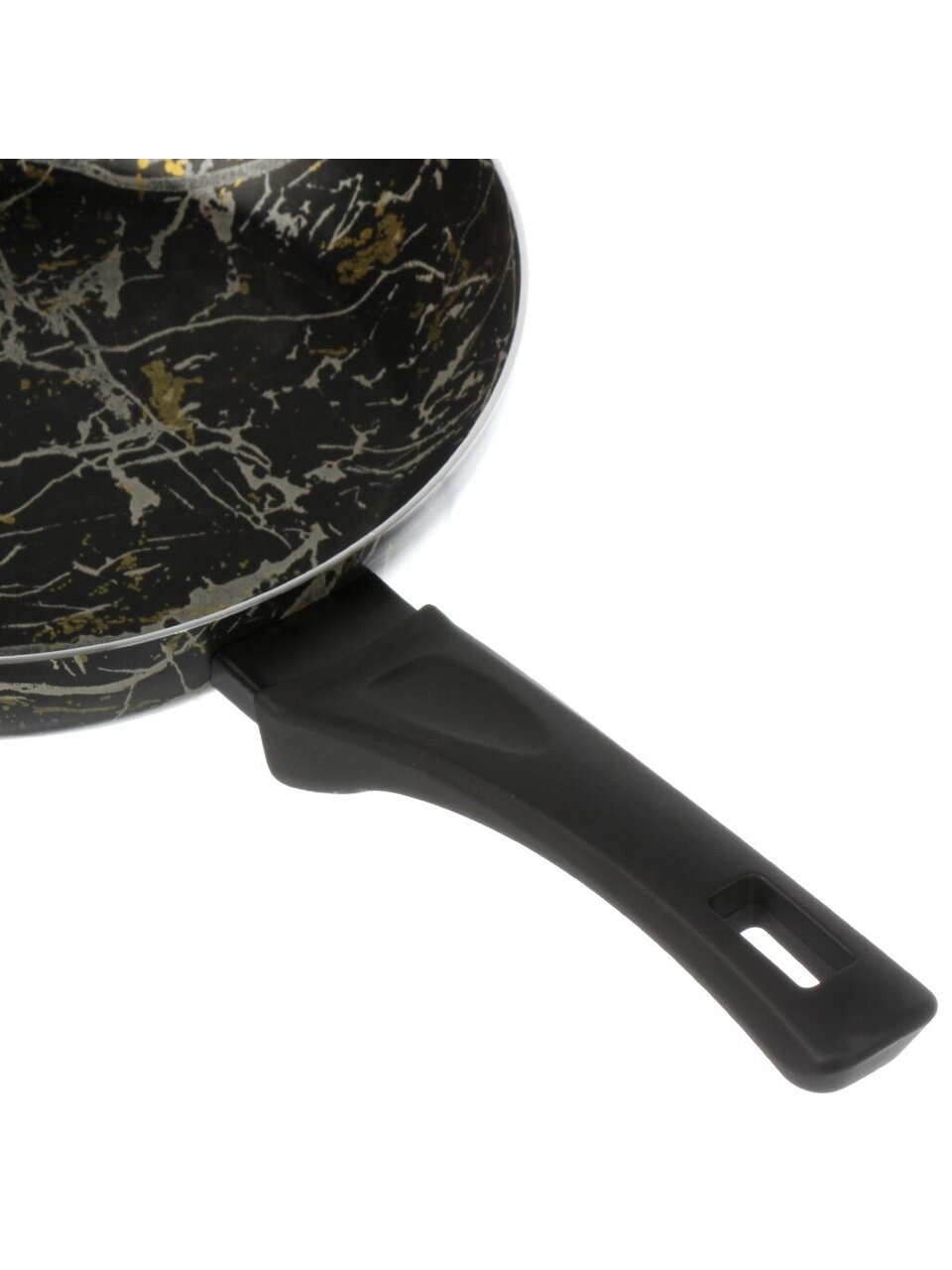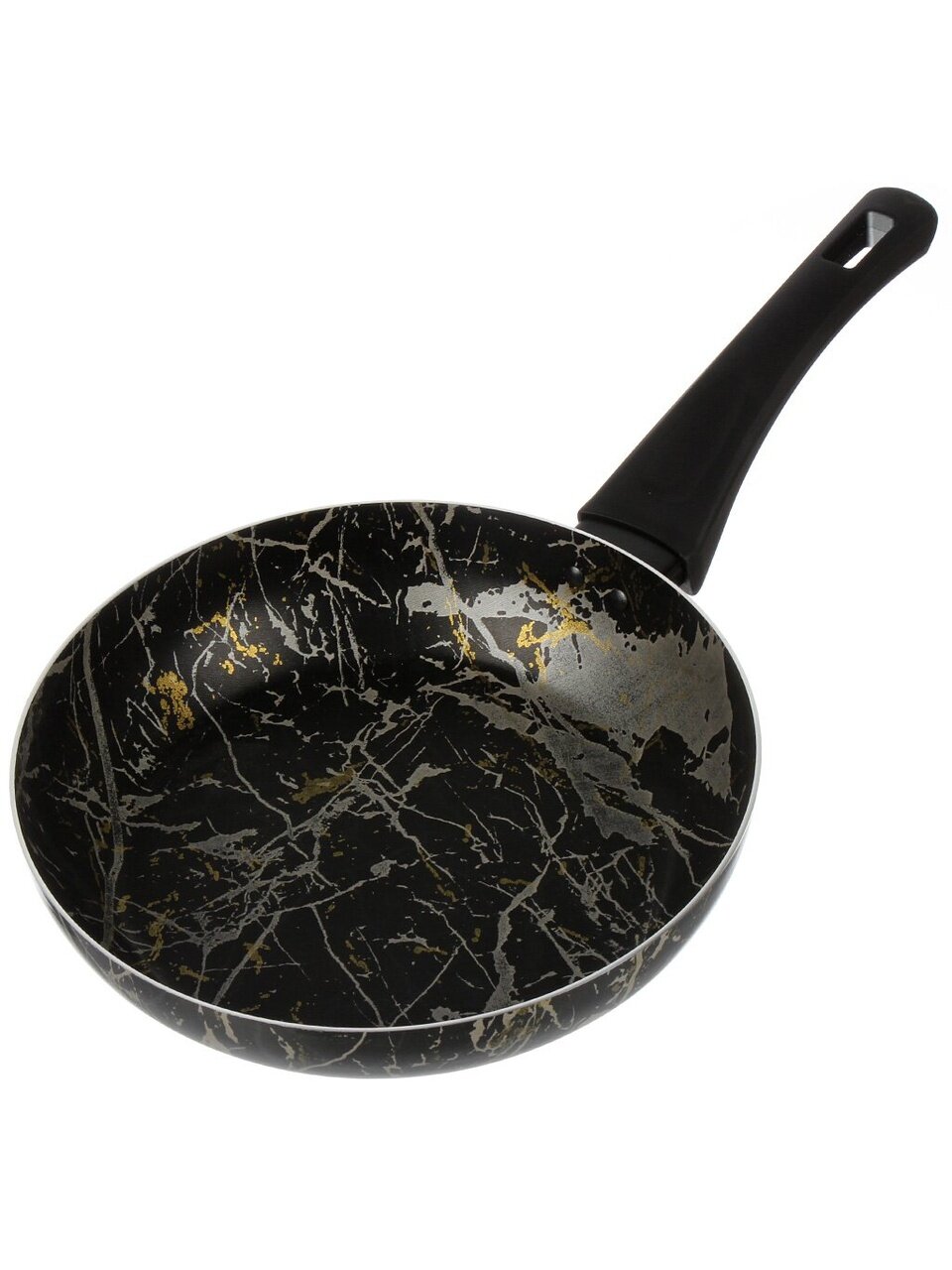 Чем отличается эта сковорода от других аналогов? Во-первых, стильный дизайн: угольно-черный фон с золотисто-белыми прожилками украсит любую кухню. Во-вторых, толщина дна и стенок 2 мм обеспечивает долговечность и защиту от деформации. Подходит для газовых, электрических и стеклокерамических плит. Если вы спрашиваете, можно ли мыть в посудомоечной машине — да, уход максимально простой. Для индукции не подходит.