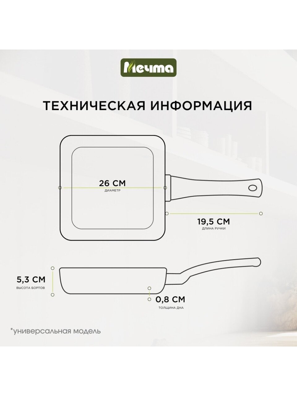 - Оптимальный размер (26×26 см), литой алюминий с толщиной дна 6 мм — равномерный нагрев, срок службы до 5 лет