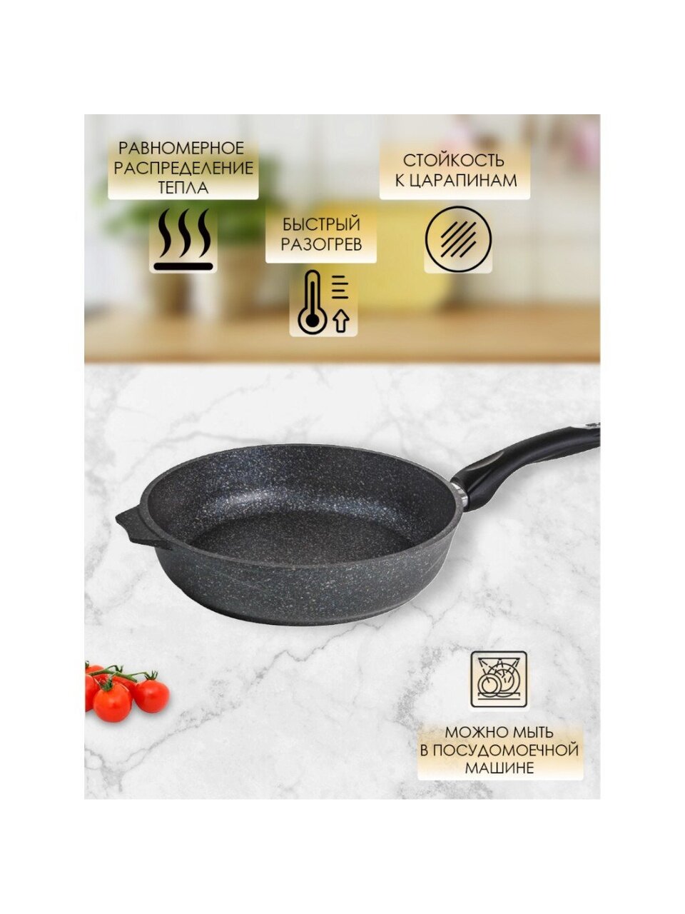Сковорода литой алюминий 26 см Мечта Гранит star: антипригарное покрытие, толщина дна 6 мм — идеальный выбор для жарки без масла и легкой очистки.