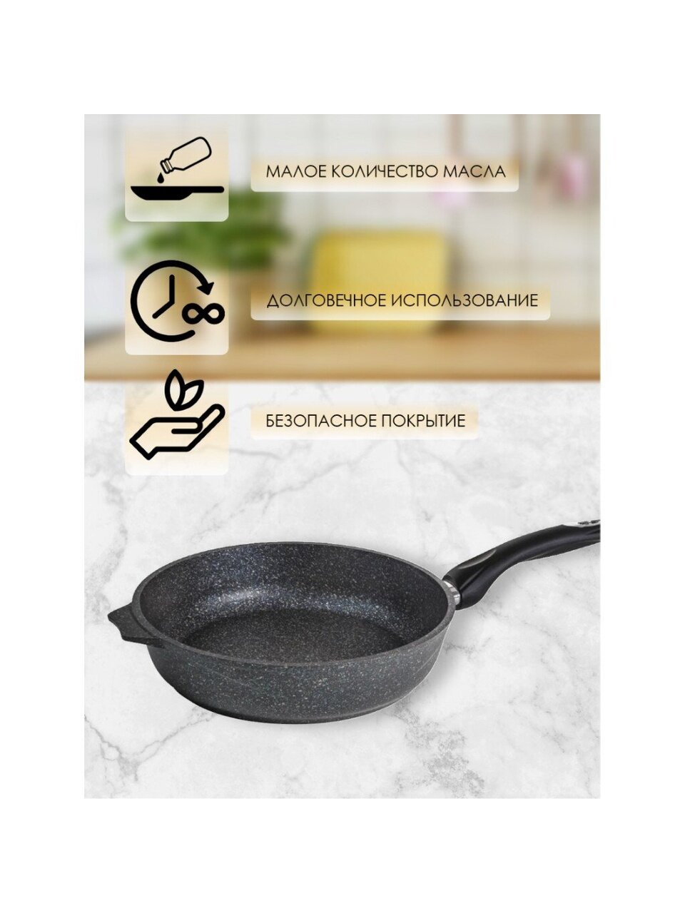 - Уникальное антипригарное гранитное покрытие — пища не пригорает даже при минимальном количестве масла
