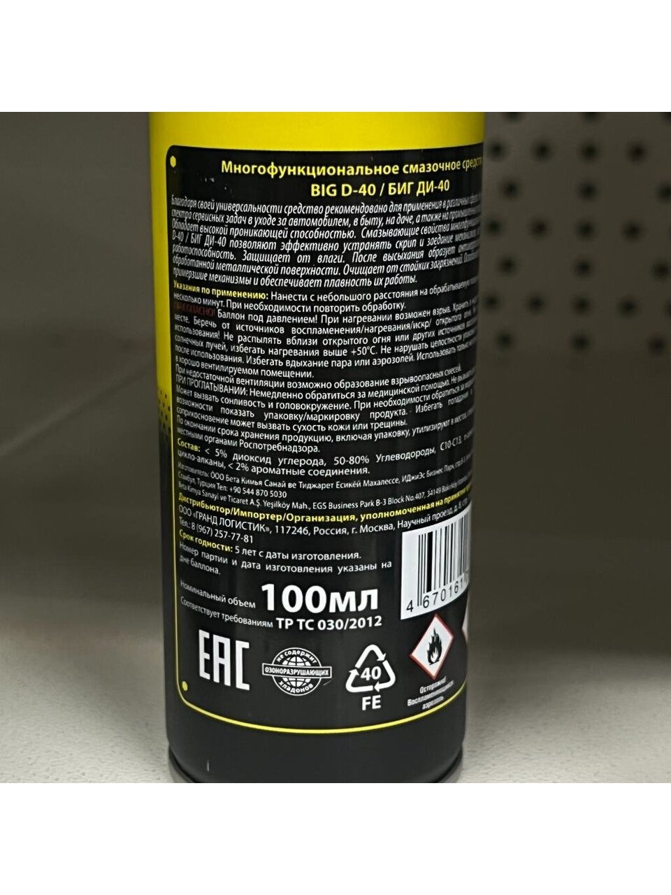 Многофункциональное смазочное средство BIG D -40 универсально, рекомендовано для применения в различных сферах: для решения широкого спектра сервисных задач в уходе за автомобилем, в быту, на даче, а также на промышленных производствах. Обладает высокой проникающей способностью.