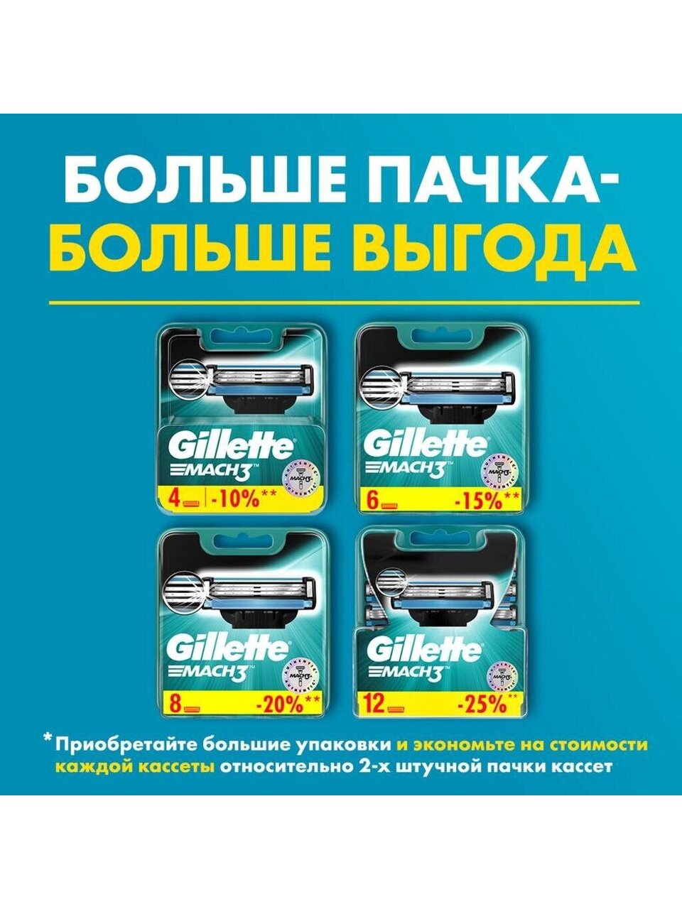 Сменные кассеты для мужской бритвы Gillette Mach3 оснащены лезвиями прочнее, чем сталь, которые дольше сохраняют остроту (по сравнению с Sensor3). Более острые режущие лезвия (первые 2 лезвия по сравнению с Sensor3) рассчитаны на 15 процедур комфортного бритья. Эта бритва Gillette оснащена смазывающей полоской, которая скользит по коже, предотвращая ее покраснение, а защитный микрогребень Skin Guard растягивает кожу и подготавливает волоски к сбриванию.