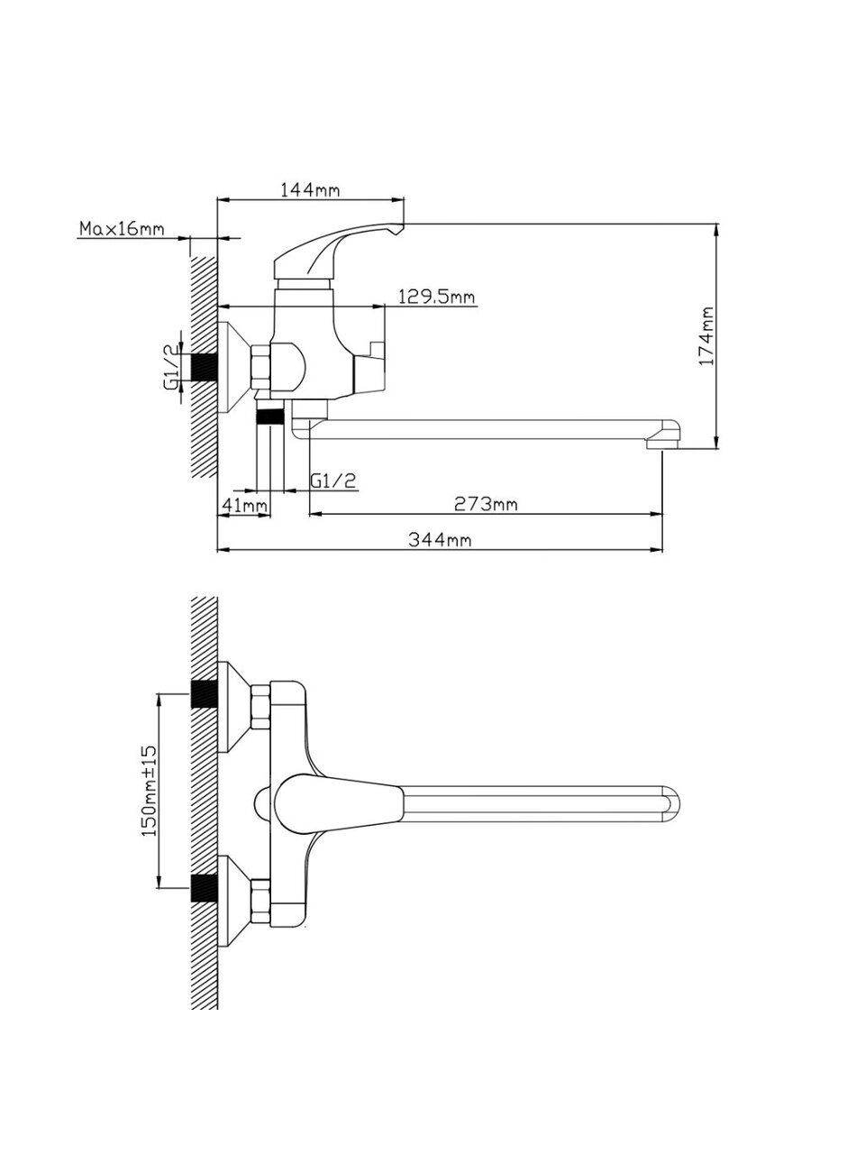 Смеситель предназначен для вертикального настенного монтажа на 2 отверстия с межосевым расстоянием 150 мм. Крепление осуществляется гайкой, стандарт подключения шланга — 1/2".
