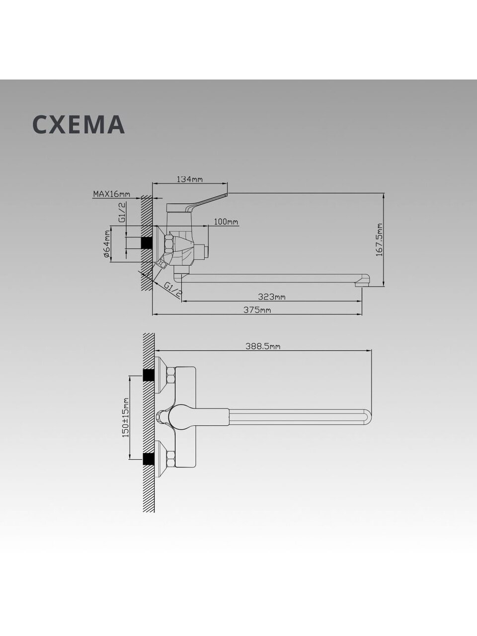 Корпус выполнен из цинкового сплава с хромированным покрытием. Монтаж — вертикальный, настенный, на 2 отверстия с межосевым расстоянием 150 мм, подводка гибкая 1/2".