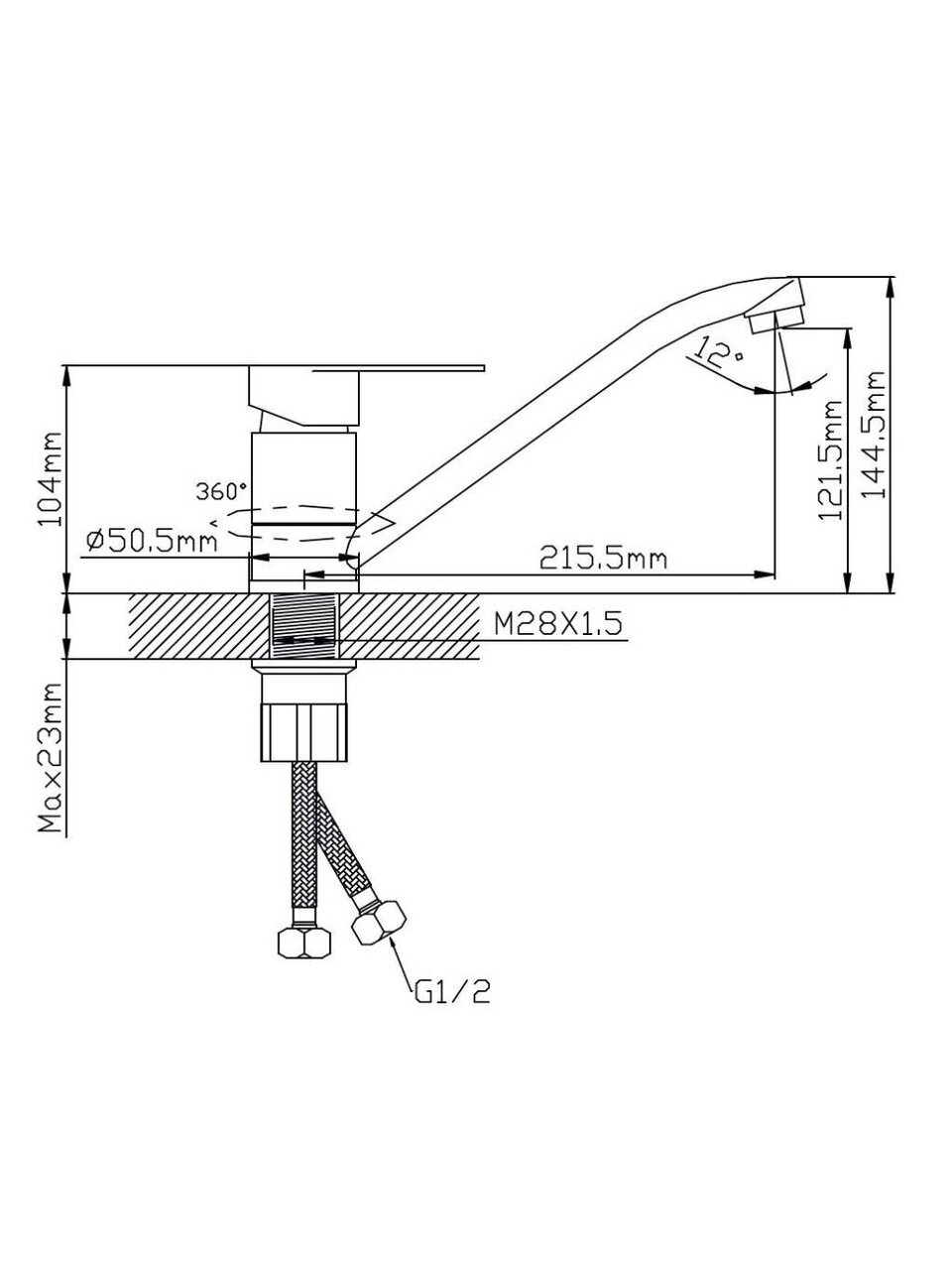 Длина излива — 21,5 см, высота — 12,1 см. Управление однорычажное, что удобно для быстрой регулировки температуры и напора воды.