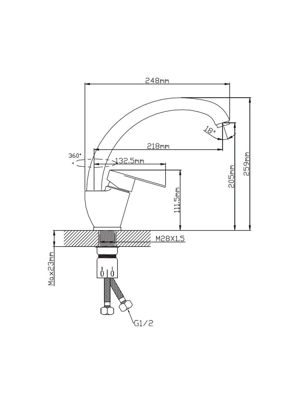 Высота излива — 20,5 см, длина — 21,8 см. Это оптимальные параметры для большинства кухонных моек.