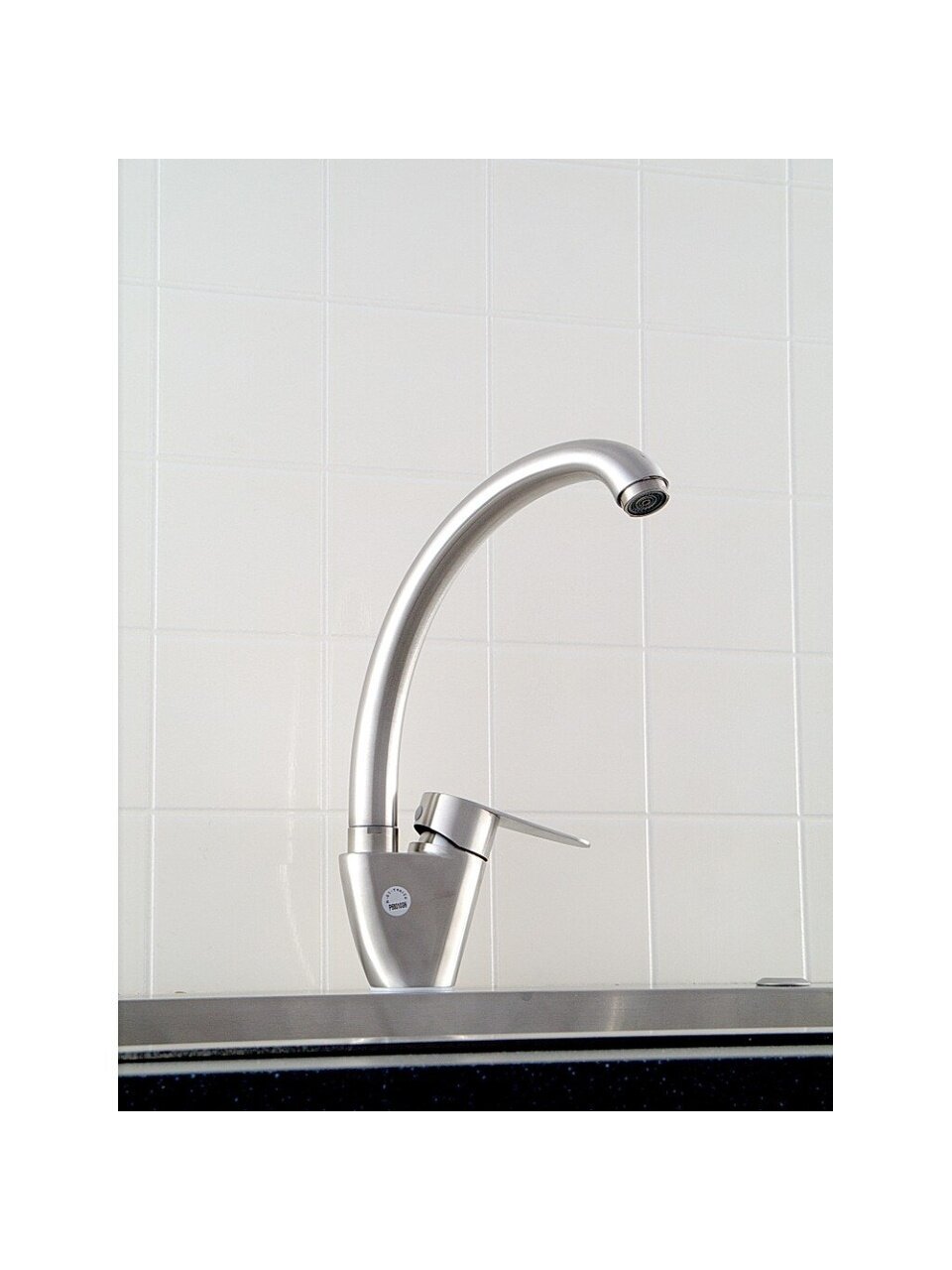 - Параметры: корпус из нержавеющей стали, глянцевая поверхность, поворотный излив высотой 20,5 см и длиной 21,8 см