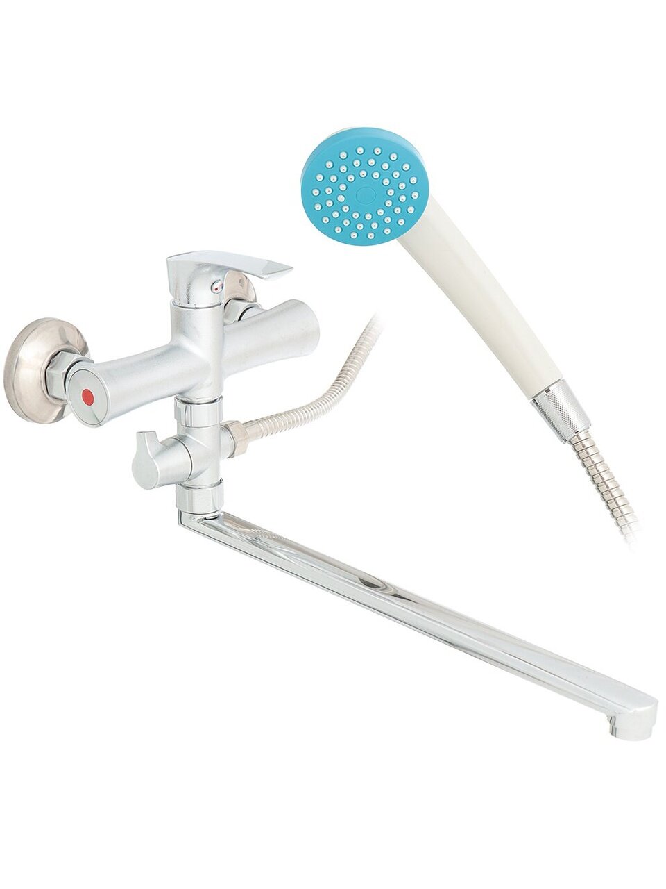 Длина поворотного излива — 35 см. Это удобно для наполнения ванны и использования душа, а также для монтажа в небольших помещениях.